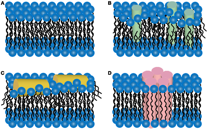Schematic representations of potential mechanisms of amyloid/lipid association. (A) A schematic representation of simplified, undisrupted lipid bilayer. This lipid bilayer structure can be perturbed by (B) membrane protein insertion or (C) association of amphiphilic α-helices with lipid surface, leading to membrane thinning and non-specific membrane leakage. (D) Many amyloid-forming proteins have been shown to form pore-like structures that can act as unregulated ion-selective channels. Reproduced from Burke et al. [65], Frontiers in Neurology. Copyright: © 2013 Burke, Yates and Legleiter. This is an open-access article distributed under the terms of the Creative Commons Attribution License.