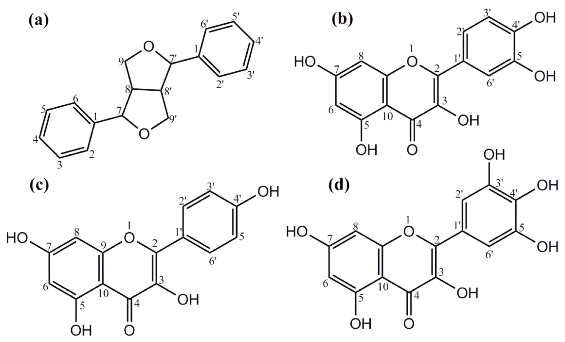 Fig. 1.Structures of phenolics and flavonoids. (a) The furanofuran lignan backbone and general structure are found in many plant-derived phenolics. Structures of some flavonoids found in L. frutescens leaf extracts: (b) quercetin, (c) kaempferol, and (d) myricetin.