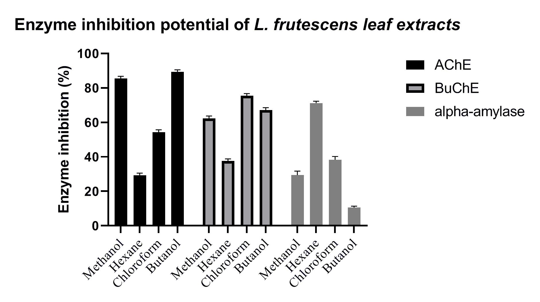 Acetylcholinesterase (AChE) and butyrylcholinesterase (BChE) were inhibited by sample extracts and the positive controls, eserine and acarbose (Fig. 3 and Table 4). BULE exhibited significant inhibitory activity against AChE, whereas CHLE exhibited the highest inhibitory activity against BChE, which was consistent with them being the best starting sources for bioassay-guided purification of AChE and butyrylcholinestrase (BuChE) inhibitors. Phytochemical analysis and spectroscopic techniques indicated the presence of lignans and alkaloids in the leaves of L. frutescens.