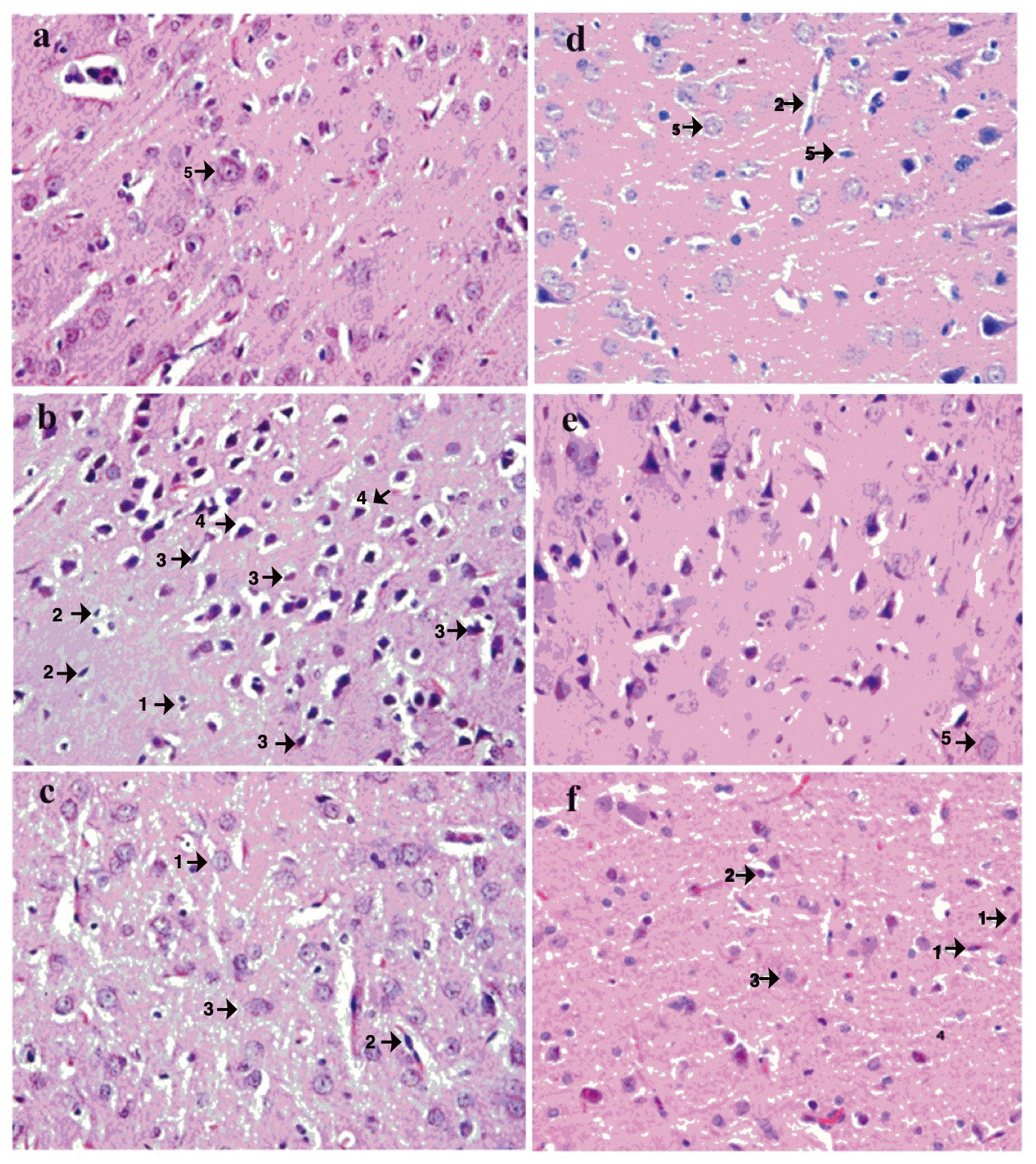 Fig. 4.Effects of BULE L. frutescens leaf extract on histopathology in representative photomicrographs of postmortem brain sections of rats administered aluminum chloride-induced (50 mg/kg/day) for 30 days. Photomicrographs are from the following treatment groups: (a) normal control receiving no aluminum chloride; (b) negative control receiving aluminum chloride but no BULE; (c) aluminum chloride-treated rats orally receiving BULE daily at 100 mg/kg/day; (d) aluminum chloride-treated rats orally receiving BULE daily at 200 mg/kg/day; (e) aluminum chloride-treated rats orally receiving BULE daily at 400 mg/kg/day; (f) positive control aluminum chloride treated rats orally receiving rivastigmine daily at 0.4 mg/kg/day. Arrow 1 shows degeneration of glial cells; arrow 2 shows degeneration of pyramidal cells; arrow 3 shows vacuolation of glial cells; arrow 4 shows vacuolation of pyramidal cells; arrow 5 shows normal large vesicular nuclei. The magnification is 40× (objective lense SP40/0.65 160mm).