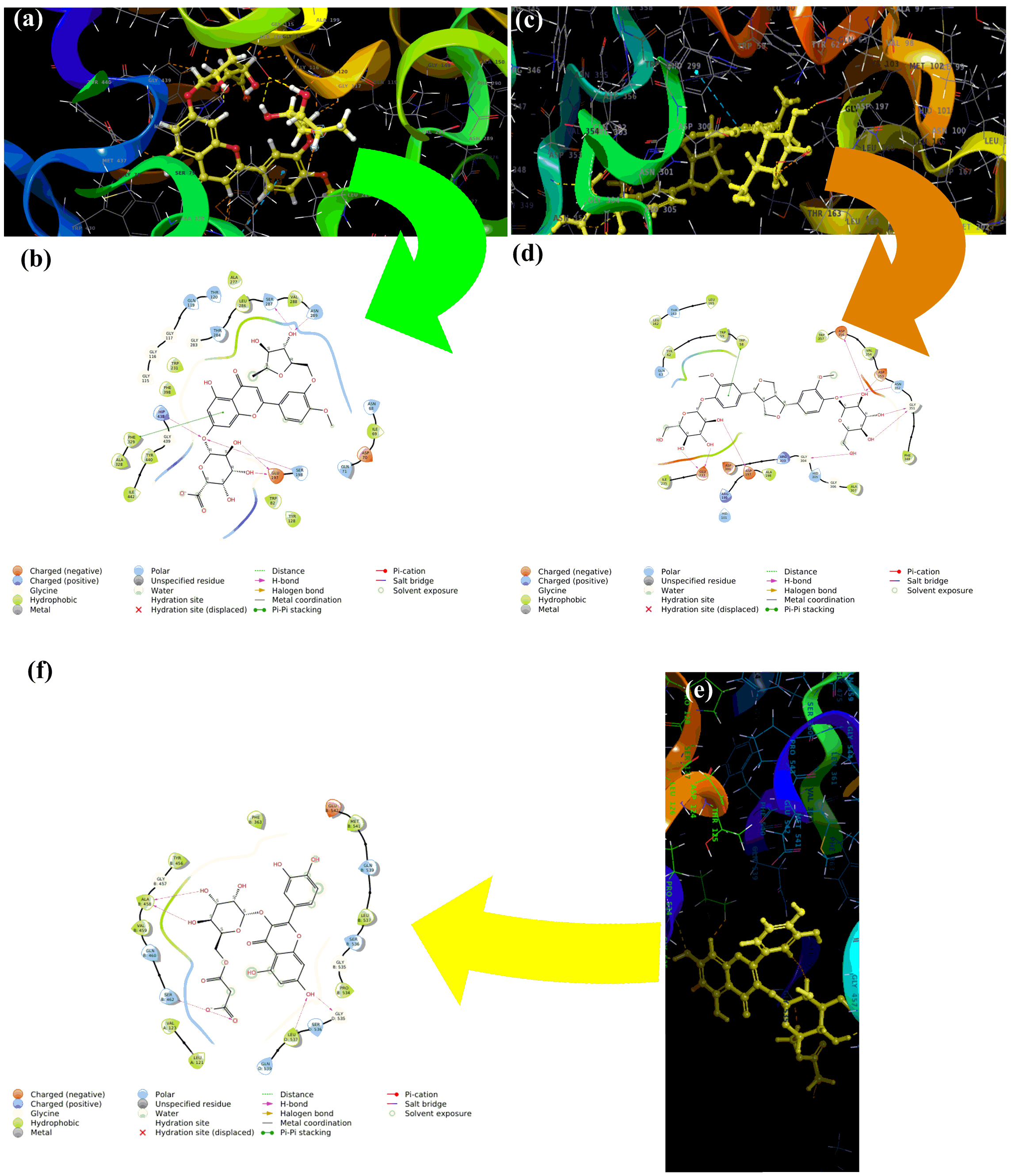 | Myricetin-3-O-acetylrhamnoside | –9.844 | Asn 83, Glu 197, Ser 198, Ser 287, His 438 | –5.469 | Gln 539, Gly 535, Leu 537, Glu 542 | –6.796 | Trp 59, Gln 63, Asn 352, Asp 356 |