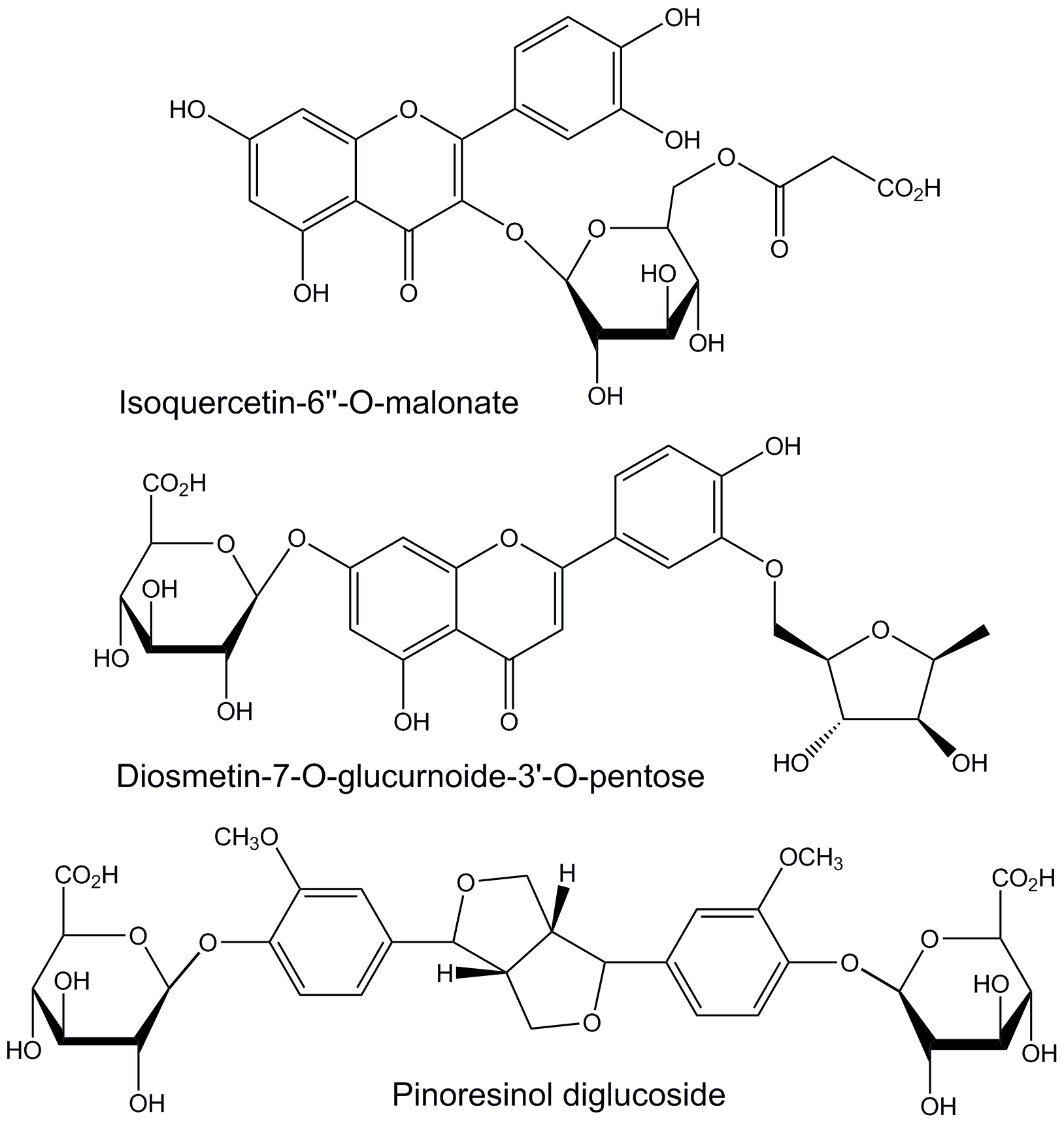 Herbal medications are generally complex mixtures of substances that usually have different mechanisms of action. Thus, they have the potential to use multiple mechanisms simultaneously to treat disease conditions that respond to combination therapy. In the case of attempting to use L. frutescens leaf extracts for neuroprotection, the three identified component phytochemicals that bound with the highest affinity to the active sites of the three mediator enzymes had very limited structural similarity (Fig. 6). These three components all have aromatic, polyphenolic core structures with peripheral glycoside moieties. The two that bind to acetylcholinesterase are flavonoid glycosides with saccharide-like free hydroxyl groups in the 3-region of the flavonoid core.