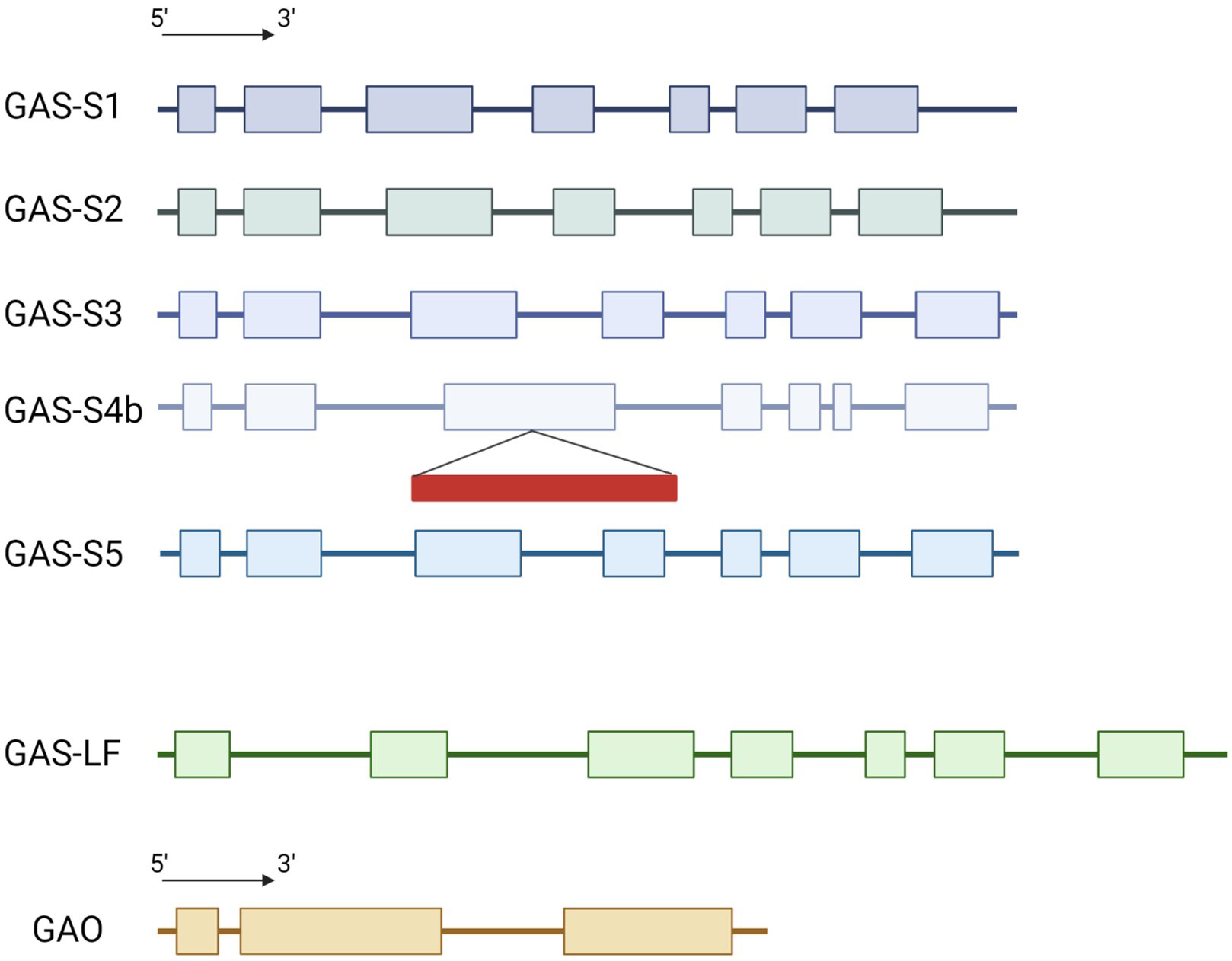 Fig. 1.Schematic representation of the structure for CiGAS and CiGAO genes. GAS-S stands for the CiGAS-short form and GAS-LF stands for the CiGAS-long form. The exons and introns lengths are proportional to the nucleotide sequences of the genes. Colored box: exon, line: intron, red rectangle: retrotransposon.