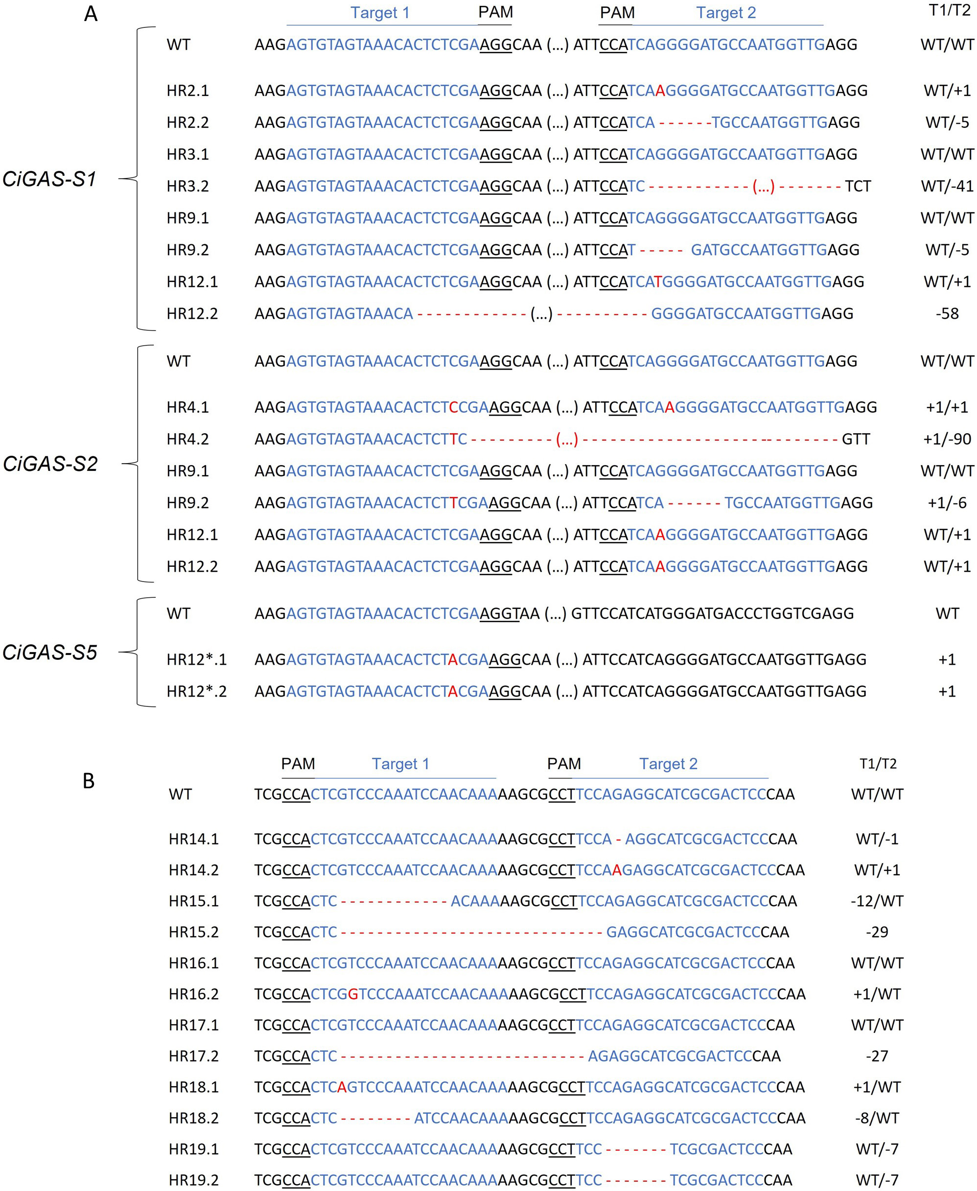For the CiGAS-short form mutants, 5 lines have been selected: line HR3, a monoallelic mutant which carries a mutation in a single allele of CiGAS-S1; line HR2, a heterozygous biallelic mutant for CiGAS-S1 where editing events induce a change in the coding frame; line HR9, a monoallelic mutant for both CiGAS-S1 and CiGAS-S2, meaning that only one allele is mutated in each of the two genes; line HR12, a heterozygous biallelic mutant for CiGAS-S1 and a homozygous biallelic mutant for CiGAS-S2, meaning there is a change in the coding frame in both of these gene copies (Supplementary Figs. 5,6), and line HR12* which is the same as line HR12 except that there is an additional homozygous biallelic mutation for CiGAS-S5 (Supplementary Figs. 5–7). For the CiGAO mutants, the 2 selected lines were: line HR16, a monoallelic mutant and line HR18, a heterozygous biallelic mutant with a change of the coding frame of its gene (Supplementary Fig. 8). The nucleotide sequences of these lines are described in Fig. 2.