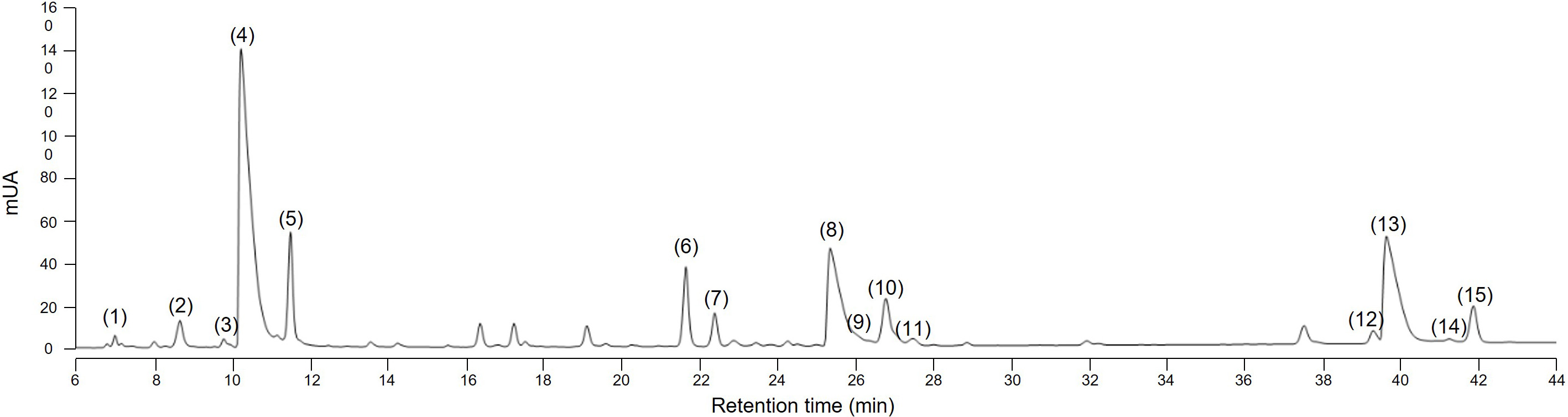Fig. 3.HPLC chromatogram at 254 nm of sesquiterpene lactones in root of the wild-type chicory ChicBitter002. (1) 11(S),13-dihydrolactucin-15-glycoside (DHLc-gly); (2) 11(S),13-dihydrolactucin-15-oxalate (DHLc-ox); (3) 11(S),13-dihydrolactucin (DHLc); (4) Lactucin-15-oxalate (Lc-ox); (5) Lactucin (Lc); (6) 8-deoxylactucin-15-glycoside (dLc-gly); (7) 11(S),13-dihydro-8-deoxylactucin-glycoside (DHdLc-gly); (8) 8-deoxylactucin-15-oxalate (dLc-ox); (9) 11(S),13-dihydro-8-deoxylactucin-15-oxalate (DHdLc-ox); (10) 8-deoxylactucin (dLc); (11) 11(S),13-dihydro-8-deoxylactucin (DHdLc); (12) 11(S),13-dihydrolactucopicrin-15-oxalate (DHLp-ox); (13) Lactucopicrin-15-oxalate (Lp-ox); (14) 11(S),13-dihydrolactucopicrin (DHLp); (15) Lactucopicrin (Lp). Identity of the molecules was confirmed by mass spectrometry.