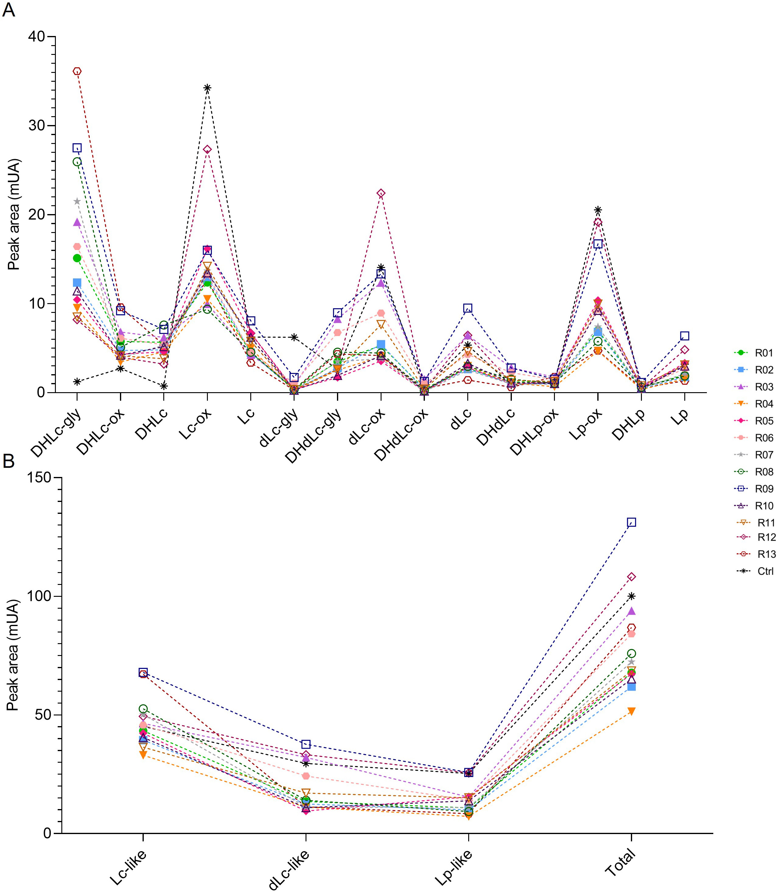 Fig. 4.STL content in roots of chicories according their peak area (mUA) obtained by HPLC analysis. (A) represents the distribution of each STL into the roots of chicories. (B) represents the STL levels of each chicories according to their structural group (Lc-like, dLc-like or Lp-like) and the total STL content of them. R01 to R13 are field-grown chicories used for sensorial analysis. Ctrl is wild-type ChicBitter002 grown under controlled condition. DHLc-gly, 11(S),13-dihydrolactucin-15-glycoside; DHLc-ox, 11(S),13-dihydrolactucin-15-oxalate; DHLc, 11(S),13-dihydrolactucin; Lc-ox, Lactucin-15-oxalate; Lc, Lactucin; dLc-gly, 8-deoxylactucin-15-glycoside; DHdLc-gly, 11(S),13-dihydro-8-deoxylactucin-glycoside; dLc-ox, 8-deoxylactucin-15-oxalate; DHdLc-ox, 11(S),13-dihydro-8-deoxylactucin-15-oxalate; dLc, 8-deoxylactucin; DHdLc, 11(S),13-dihydro-8-deoxylactucin; DHLp-ox, 11(S),13-dihydrolactucopicrin-15-oxalate; Lp-ox, Lactucopicrin-15-oxalate; DHLp, 11(S),13-dihydrolactucopicrin; Lp, Lactucopicrin. Lc-like, sum of all DHLc and Lc forms; dLc-like, sum of all DHdLc and dLc forms; Lp-like, sum of all DHLp and Lp forms; Total, sum of the 15 identified STLs.