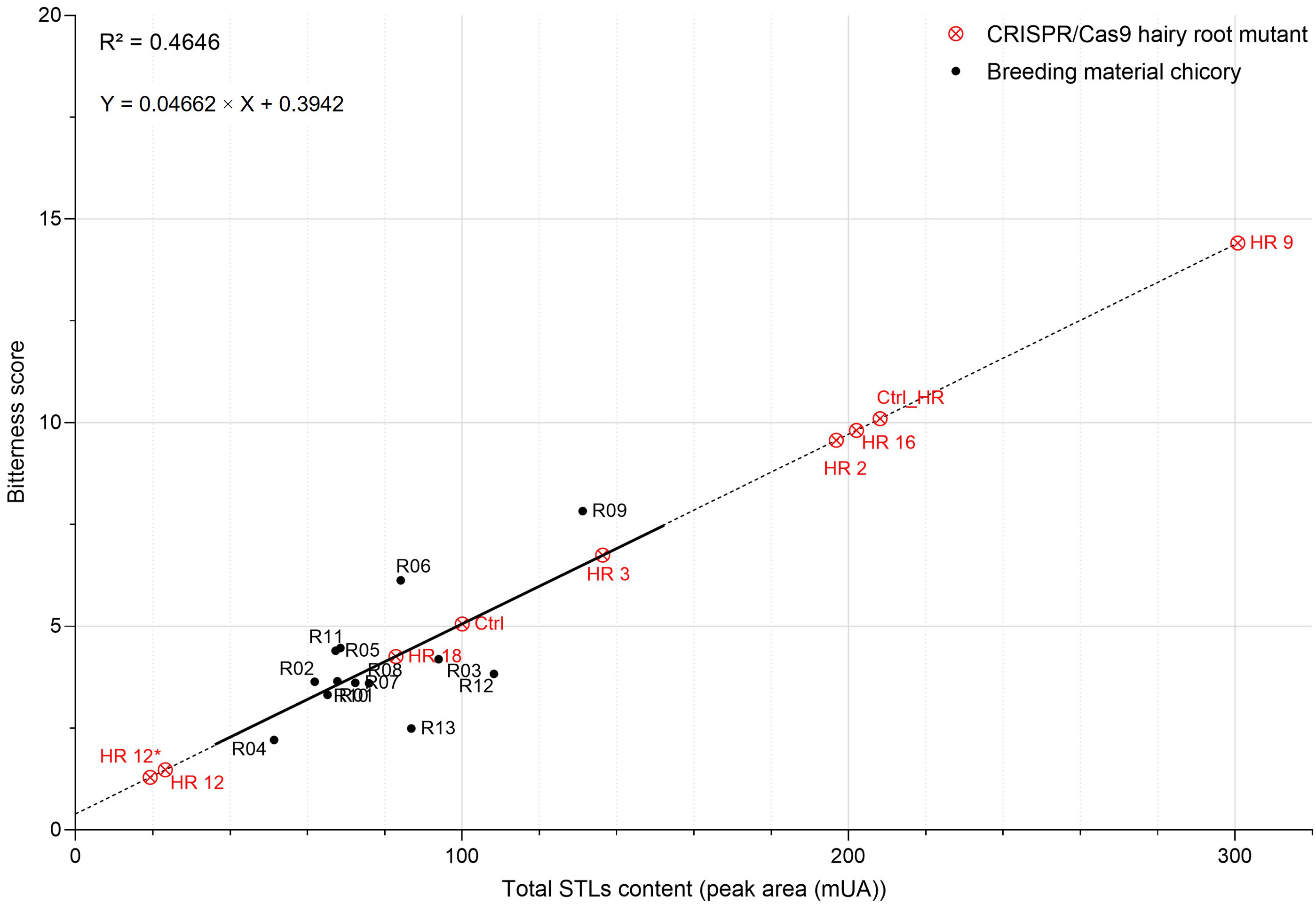 Interest in using C. intybus as a functional ingredient has increased in the last few years and chicory flour has recently been shown to have multiple health benefits [5, 6]. Many articles have focused on the use of chicory root as a functional ingredient in food products such as yogurts and biscuits but also as chicory flour to be added to crackers, cakes and bread [7, 65, 66, 67, 68, 69, 70]. However, the amount of chicory used in these products never exceeds 5% because its bitterness causes a rejection by consumers. Several debittering methods have been investigated in chicory over the past years. For example, a change in the growing conditions can be responsible for a less bitter chicory taproot, chicory roots can be bleached or soaked into water for several hours, or low bitter taproot chicories can be bred by classical breeding approach [56, 71, 72]. However genetic engineering can also be used in chicory to reduce STL content in Cichorium intybus L. CRISPR/Cas9 is a useful tool for elucidating gene function that has been used to help breeding and to improve crops such as maize, rice, or wheat [23, 73, 74, 75, 76]. In this work, we successfully used the CRISPR/Cas9 system to inactivate CiGAS-short form and CiGAO genes and showed that biallelic mutations are required to reduce STL content. Given the limitations of current European legislation on the use of CRISPR/Cas9-modified plants, it was not possible to perform a sensory analysis and establish a direct link between bitterness and the amount of STLs in HR chicory lines. Therefore, an indirect link was established by performing sensory analysis of thirteen field-grown chicories, which allowed us to define a bitterness scale based on STLs content and to establish a theoretical bitterness score for the HR mutant lines. We identified three HR mutant lines with significantly reduced STLs content: the HR12 and HR12* lines, that have a theoretical bitterness score between 1 and 2 meaning that bitterness is almost no more perceived, and the HR18 line which has a bitterness score decreased by 57.8% compared to the “Ctrl_HR” which is much more bitter than industrial chicories grown in fields because of the integration of T-DNA in ChicBitter002. Using the CRISPR/Cas9 tool, we were able to modulate the bitterness of C. intybus and identify the genes responsible for this. To our knowledge, this is the first time that the effect of CRISPR/Cas9 edited chicory on bitterness can be assessed, even indirectly. The new CRISPR/Cas9-based biotechnology has proven once again to be more efficient and accurate, less energetic and less expensive in time than the other techniques of debittering. As plants obtained by using CRISPR/Cas9 technology are considered to be genetic modified organisms by the current European legislation they cannot be used directly but will provide useful data to breeders to develop and propose less bitter varieties of chicory by molecular marker-assisted breeding. The mutants are also an excellent research material to study the biological activities of STLs.