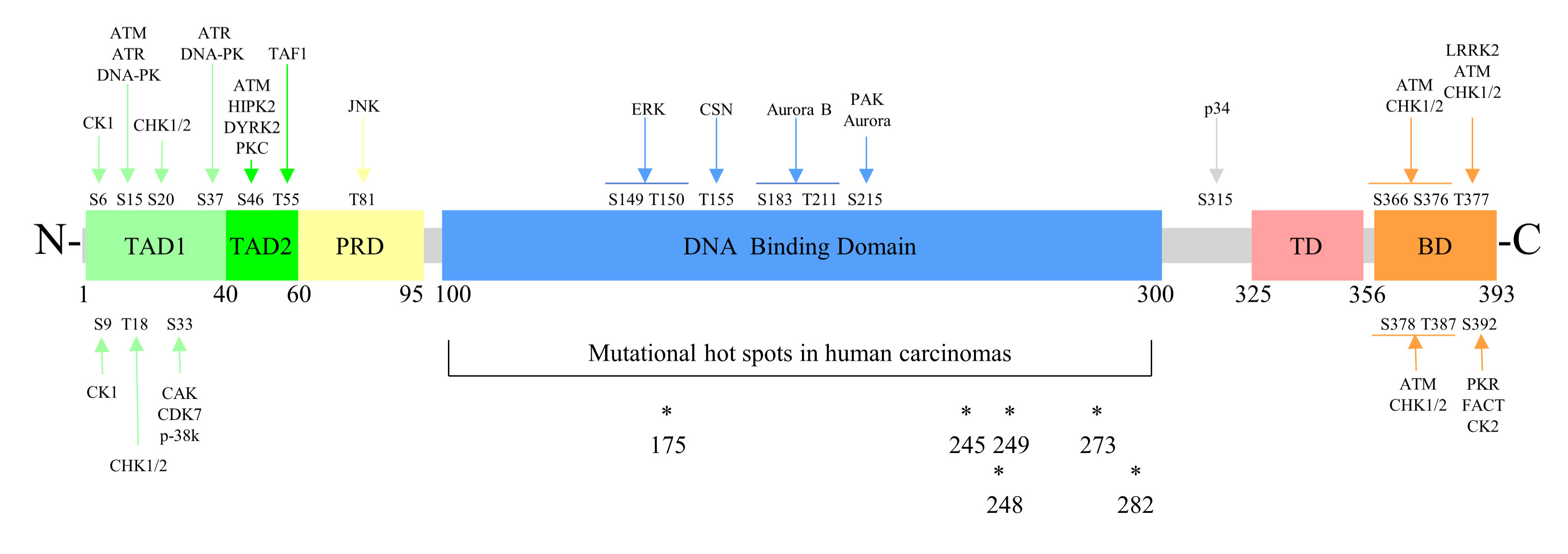 Fig. 1.The brief structure and partial phosphorylation sites of p53 protein. S, serine; T, threonine; CK, casein kinase; ATM, ataxia telangiectasia mutated; ATR, ataxia telangiectasia and Rad3 related protein; DNA-PK, DNA-dependent protein kinase; CHK, checkpoint kinase; CAK, cyclin dependent kinase-activating kinase; CDK, cyclin dependent kinase; HIPK2, homeodomain-interacting protein kinase 2; DYRK2, dual-specificity tyrosine-phosphorylation kinase; PKC, protein kinase C; TAF1, TATA-box binding protein associated factor 1; JNK, c-Jun NH2-terminal kinase; ERK, extracellular signal-regulated kinase; CSN, COP9 signalosome associated kinase complex; PAK, protein activated kinase; LRRK2, leucine-rich repeat kinase 2; PKR, protein kinase R; FACT, facilitates chromatin transcription; *, mutational hot spots in human carcinomas.