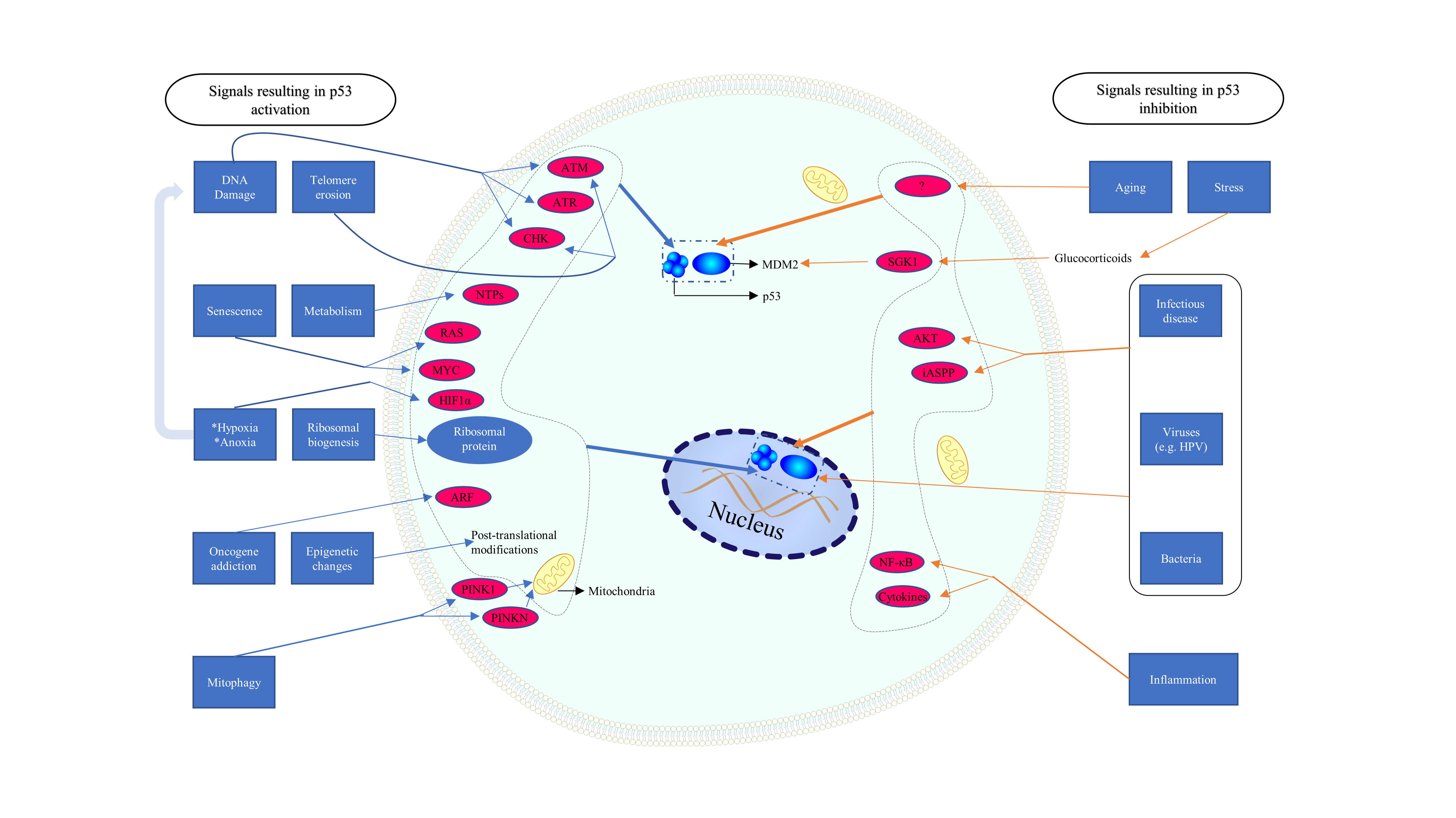 Fig. 2.Different signals inducing specific p53 reactions. ATM, ataxia telangiectasia mutated; ATR, ataxia telangiectasia and Rad3 related protein; CHK, checkpoint kinase; NTP, nucleoside triphosphate; PINK 1, PTEN induced putative kinase 1; PRKN, Parkin; ARF, alternate reading frame; HIF, hypoxia-inducible factor; SGK, serum and glucocorticoid regulated kinase; ASPP, apoptosis stimulating proteins of p53.