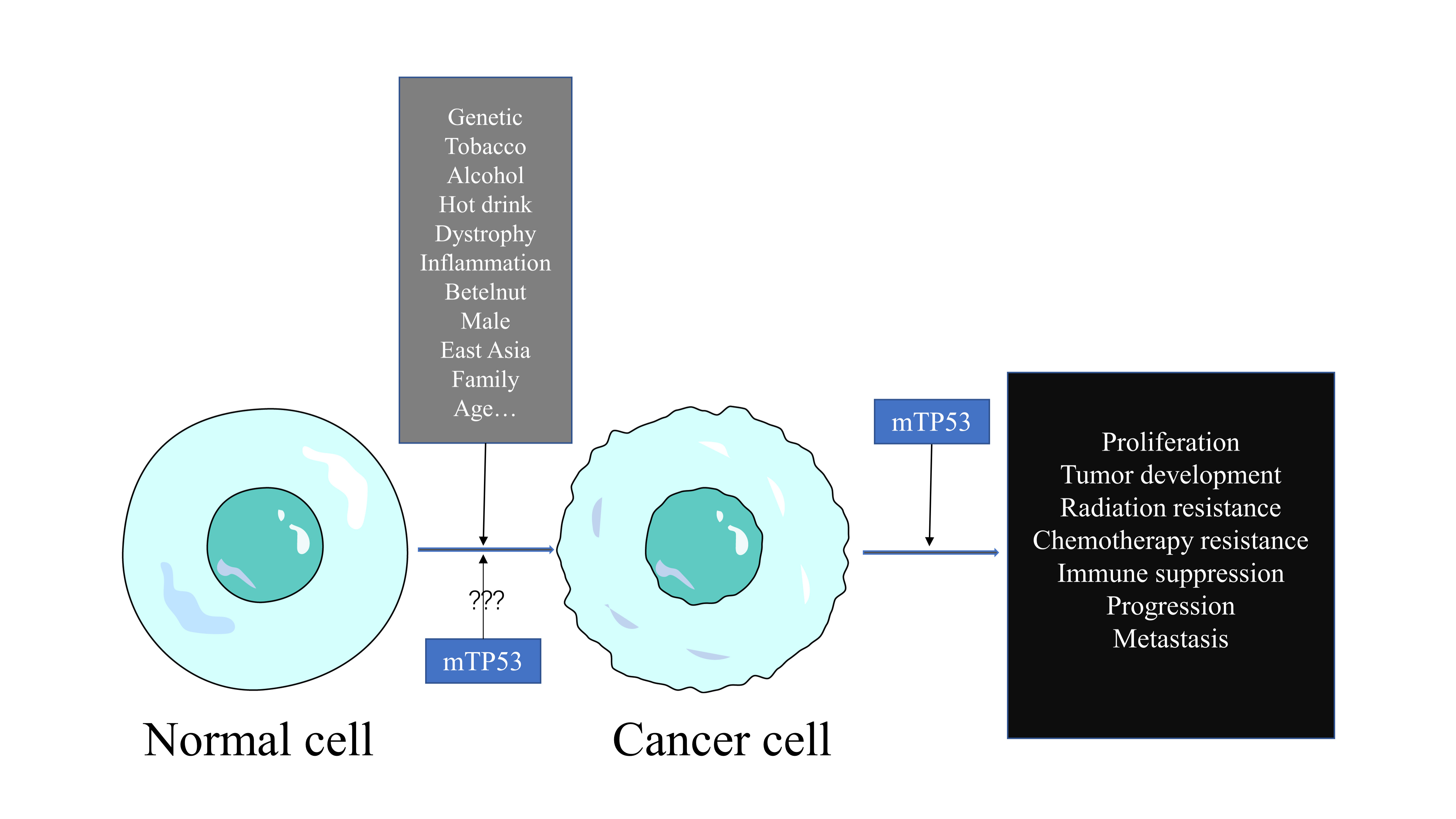 Somatic TP53 mutations in human malignant tumors were first described by Baker et al. [34] in colorectal cancer in 1989. Since then, research on TP53 mutations in human cancers has mushroomed over the intervening decades, and many studies have found that biallelic mutations in TP53 were the most frequent mutational signature of human malignancies, including ESCC [11, 24, 35]. In contrast to other neoplasm suppressive genes, TP53 is often found to undergo missense mutations, in which a single nucleotide is substituted by another [36, 37]. TP53 mutations can result in dissimilar consequences, from the loss-of-function (LOF) necessary for tumor suppression to the dominant-negative (DN) and even the gain-of-function (GOF) necessary for tumor growth and treatment resistance [35, 38]. More specifically, LOF mutations in cancers could derail the ability of wild-type TP53 to maintain genomic stability. In contrast, some GOF mutations can induce oncogenic activity that promotes carcinogenesis, and some specific mutations even enable cancer cells to acquire the capacity to maintain proliferation, become more invasive, and allow metastasis and resistance to therapy.