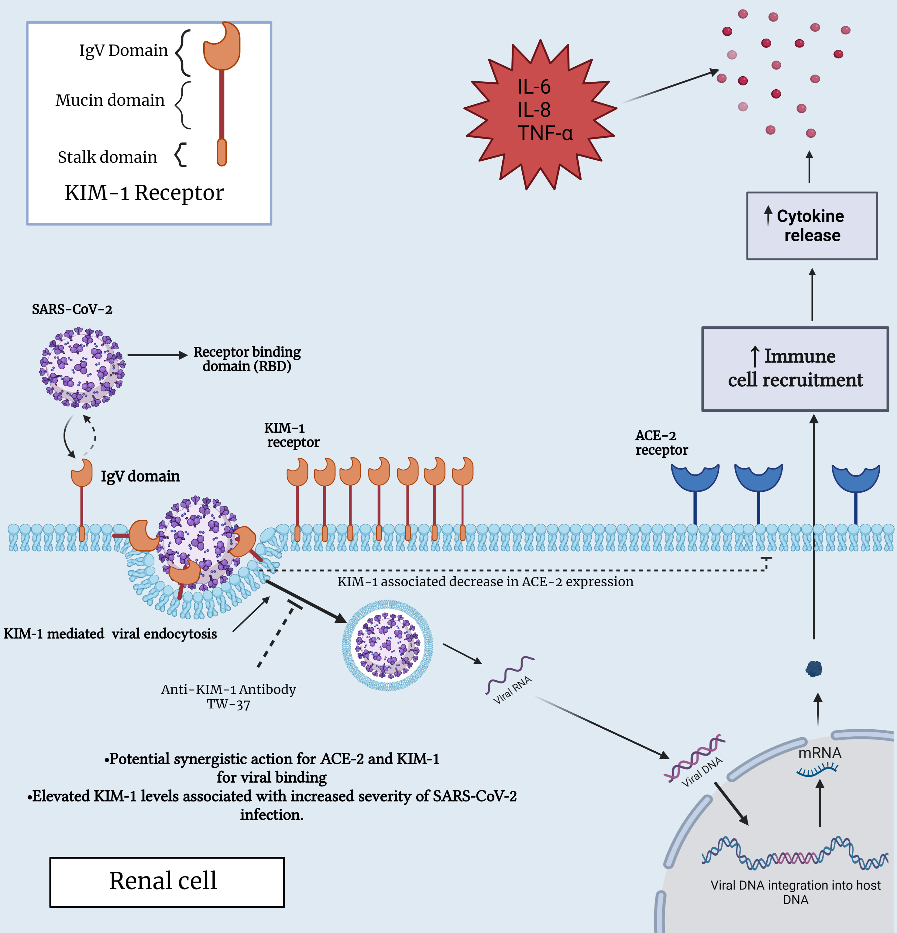 Previously, studies have proven the presence of SARS-CoV-2 in the kidneys, particularly in epithelial cells, thereby suggesting a potential direct infectivity [23, 24, 89]. The IgV-domain in KIM-1 provides a means for viral invasion through its interaction with the PS constituent of the viral envelope, as demonstrated with hepatitis A and C, human immunodeficiency virus (HIV), Ebola, Dengue, and other viruses [90]. SARS-CoV-2 is known to recognize and target ACE2 receptors in the invasion process via its receptor-binding domain (RBD). KIM1 and ACE2 are both expressed in the kidney. Thus, upon renal injury, KIM-1 levels drastically increase with subtle changes in ACE2 levels [91]. Conversely, renal levels of ACE2 have been reported to decrease during SARS-CoV-2 infection [92]. Supported by the following observations, the sole responsibility of ACE2 in renal SARS-CoV-2 infection was questioned and redirected towards the prospect of KIM-1 participation. Theoretically, KIM-1 seems capable of creating a vicious cycle manifested by injury-induced KIM-1 expression.