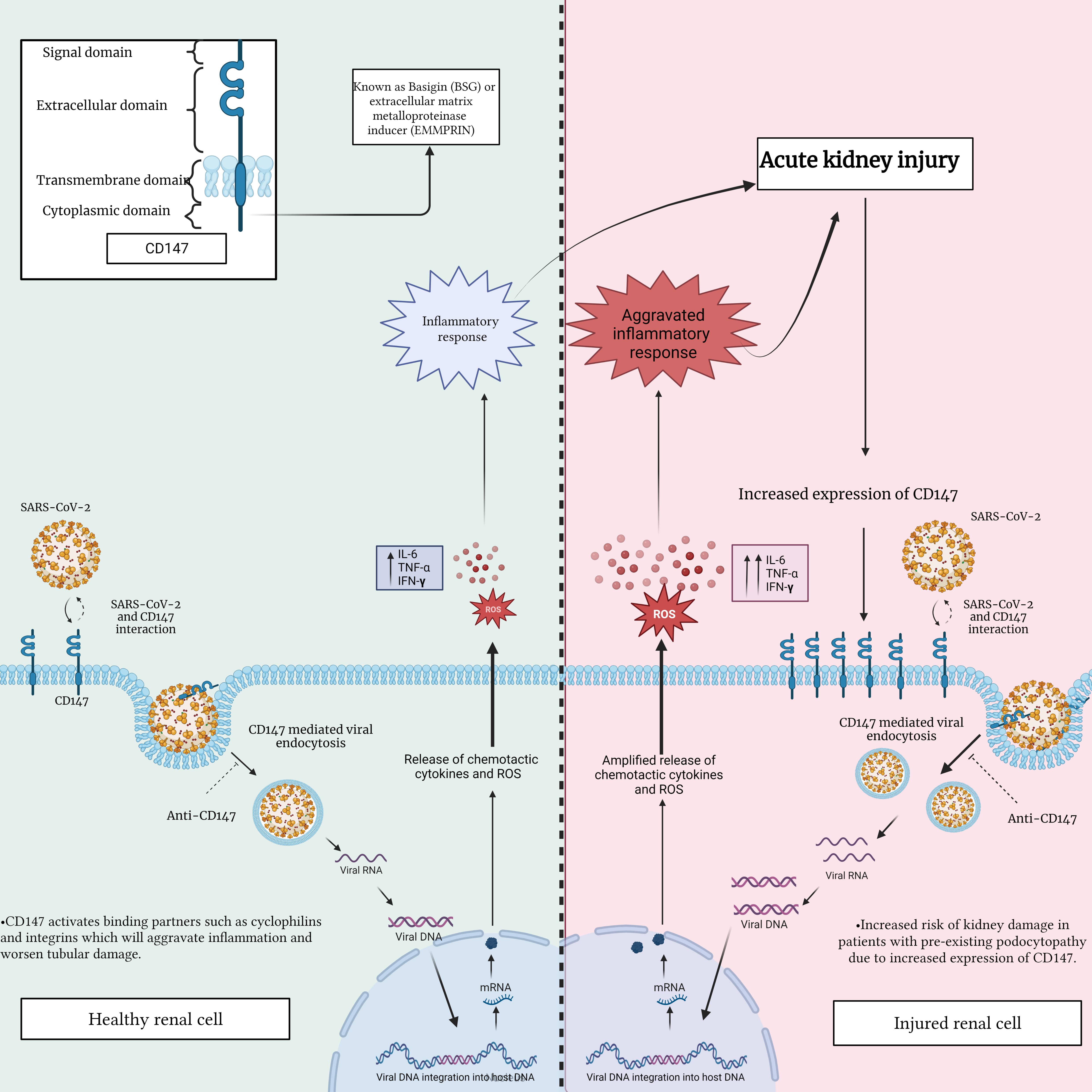 Numerous biological roles have been associated with CD147. At the immunological level, CD147 is suggested to act as a potential negative regulator of T-cell activation [105], as well as a receptor for viral entry in host cells in the context of HIV [106]. Additionally, at the inflammatory level, CD147 has been shown to be engaged in inflammatory diseases, such as cardiac infarction, atherosclerosis, AKI, and renal fibrosis [101, 107, 108, 109].