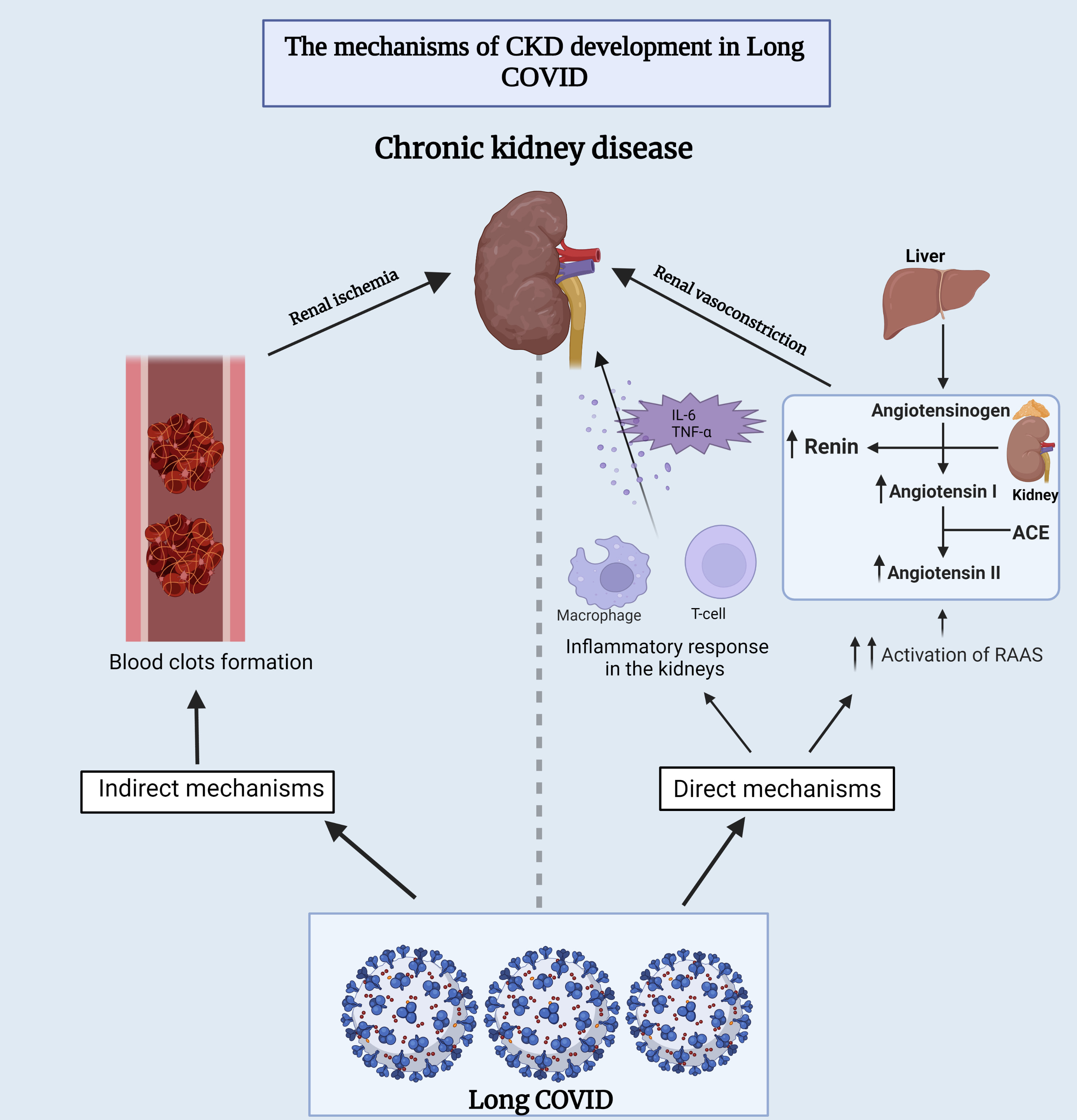 Several theories have been proposed to understand the fundamental mechanism between long-COVID and CKD. One is that long-term COVID-19 may cause direct renal damage by infiltrating inflammatory cells or through the overactivation of the renin-angiotensin-aldosterone (RAAS) system, which is thought to enhance kidney damage over time [138]. The other hypothesized mechanism is through the formation of blood clots, which in turn leads to ischemia in the kidneys and subsequent tissue damage [138] (Fig. 4).