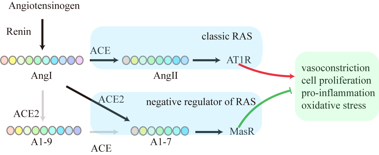 Classic and negative regulator of RAS. ACE, angiotensin-converting enzyme; ACE2, angiotensin-converting enzyme 2; A1-9, angiotensin 1-9; A1-7, angiotensin 1-7; Ang I, angiotensin I; Ang II, angiotensin II; AT1R, type 1 angiotensin II receptor; RAS, renin-angiotensin system.