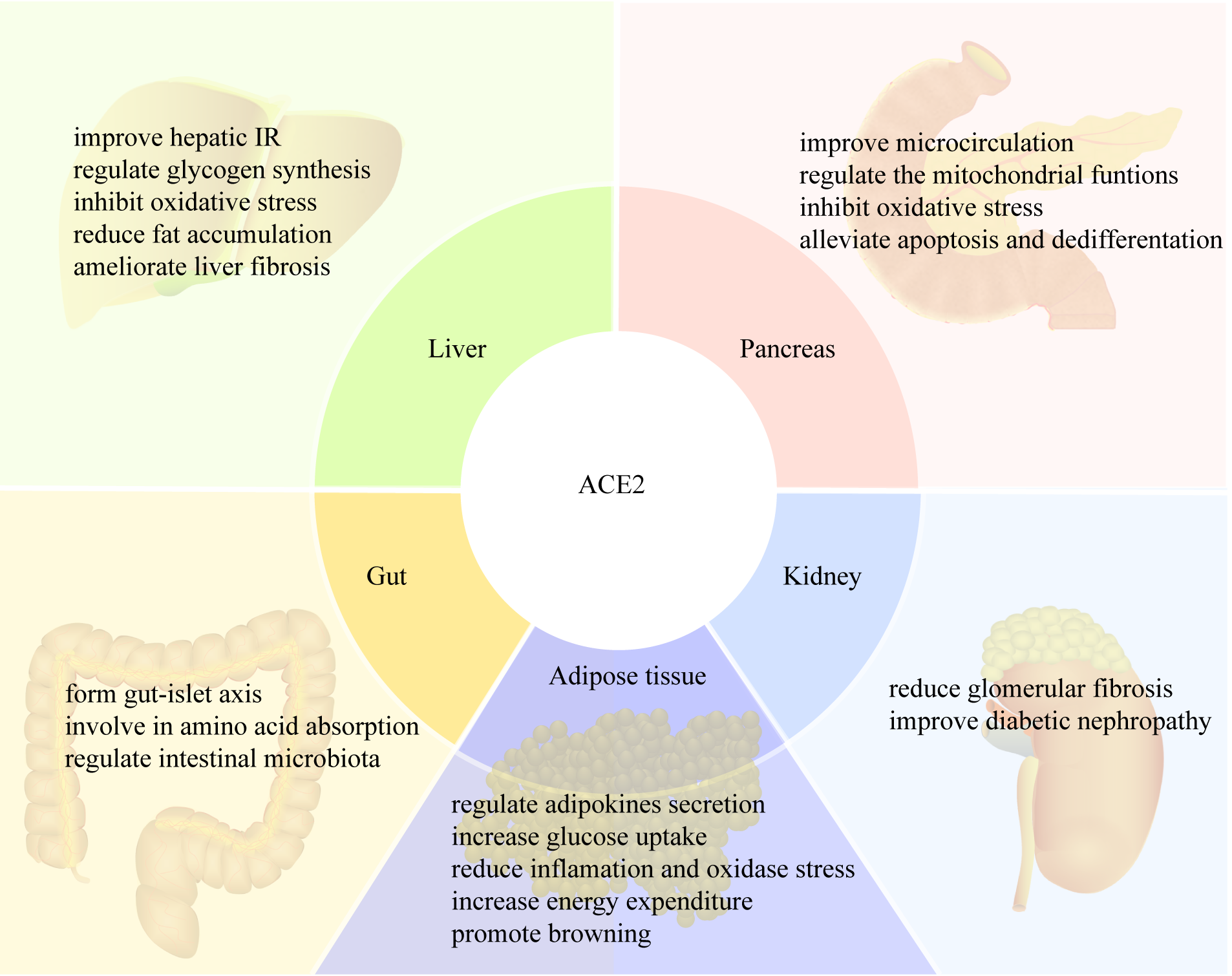 Angiotensin-converting enzyme 2 (ACE2) has two fundamental physiological functions. The first is a mono-carboxypeptidase that catalyzes a single residue from Angiotensin Ⅰ (Ang Ⅰ) and Ang Ⅱ to form Angiotensin1-9 (A1-9) and A1-7. The former can be converted to A1-7 by Angiotensin-converting enzyme (ACE) [1]. The second function of ACE2 is as a critical regulator of dietary amino acid uptake in the gastrointestinal tract. The generation of A1-7 is a vital mechanism of ACE2-mediated counteract regulator in renin-angiotensin system (RAS). Hypertension, Type 2 diabetes (T2DM), obesity and non-alcoholic fatty liver disease (NAFLD) are associated with disturbances in the RAS and changes in the expression level of ACE2 [2]. A local RAS occurs in the lung, liver, testis, cardiovascular system, gastrointestinal tract, kidney, pancreas and adipose tissue [3]. This affects metabolic organs and the progression of metabolic diseases. The current review describes the role of ACE2 in the regulation of glycolipid metabolism in different tissues, with the aim of finding effective therapeutic targets for metabolic diseases.