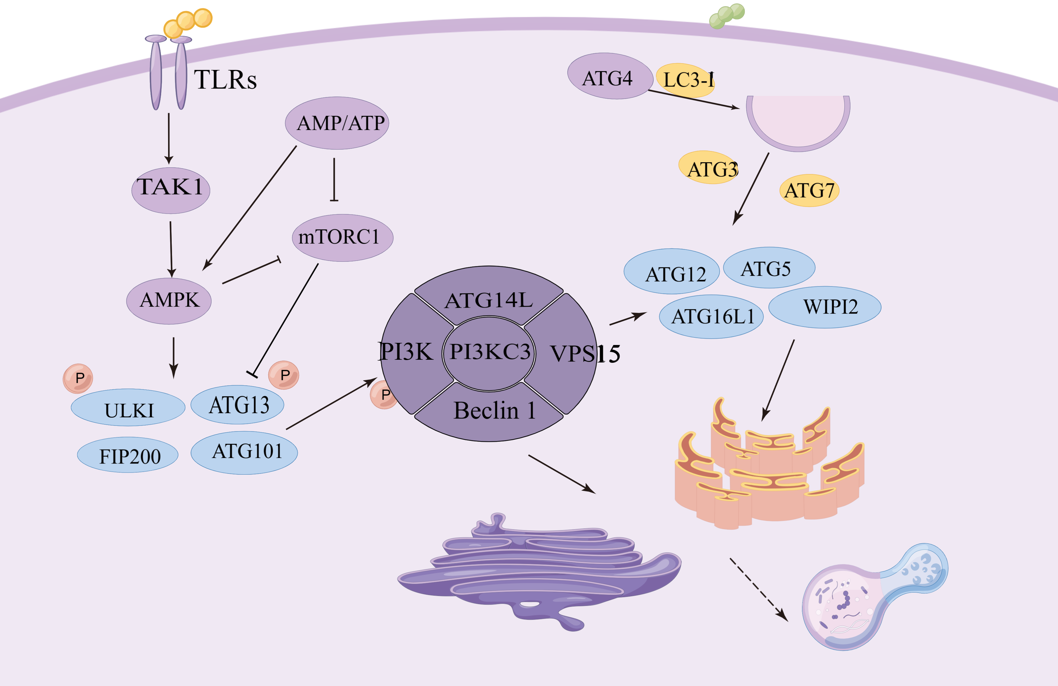Fig. 1.Autophagy process. Under starvation conditions, MTORC1 activity is inhibited, AMPK is activated, and they promote activation ULK1 complex (ULK1⁃ATG13⁃FIP200⁃ATG101) formation, which mediates the initiation of autophagy. The activation of the ULK1 complex phosphoinositide PI3KC3 complex (Beclin1⁃PI3K⁃VPS15⁃ATG14L) mediates the formation of pre autophagosomal structure in membranous organelles such as endoplasmic reticulum and Golgi apparatus; The PI3KC3 complex further recruits the ATG16L1 complex (ATG16L1⁃ATG12⁃ATG5); LC3⁃I formed by ATG4 cleavage of LC3 precursor is recruited to the autophagic vesicles, under the influence of ATG7 and ATG3. When exposed to phosphatidylethanolamine (PE) is modified to fat-soluble LC3 (i.e., LC3⁃II). Then LC3⁃II can further bind to the newly formed autophagy membrane to promote autophagosome fusion and expansion. MTORC1, mammalian target of rapamycin C1; AMPK, adenosine monophosphate-activated protein kinase; ULK1, (Human) recombinant protein; PI3KC3, recombinant phosphoinositide-3-kinase class 3; LC3, microtubule-associated protein light chain 3.