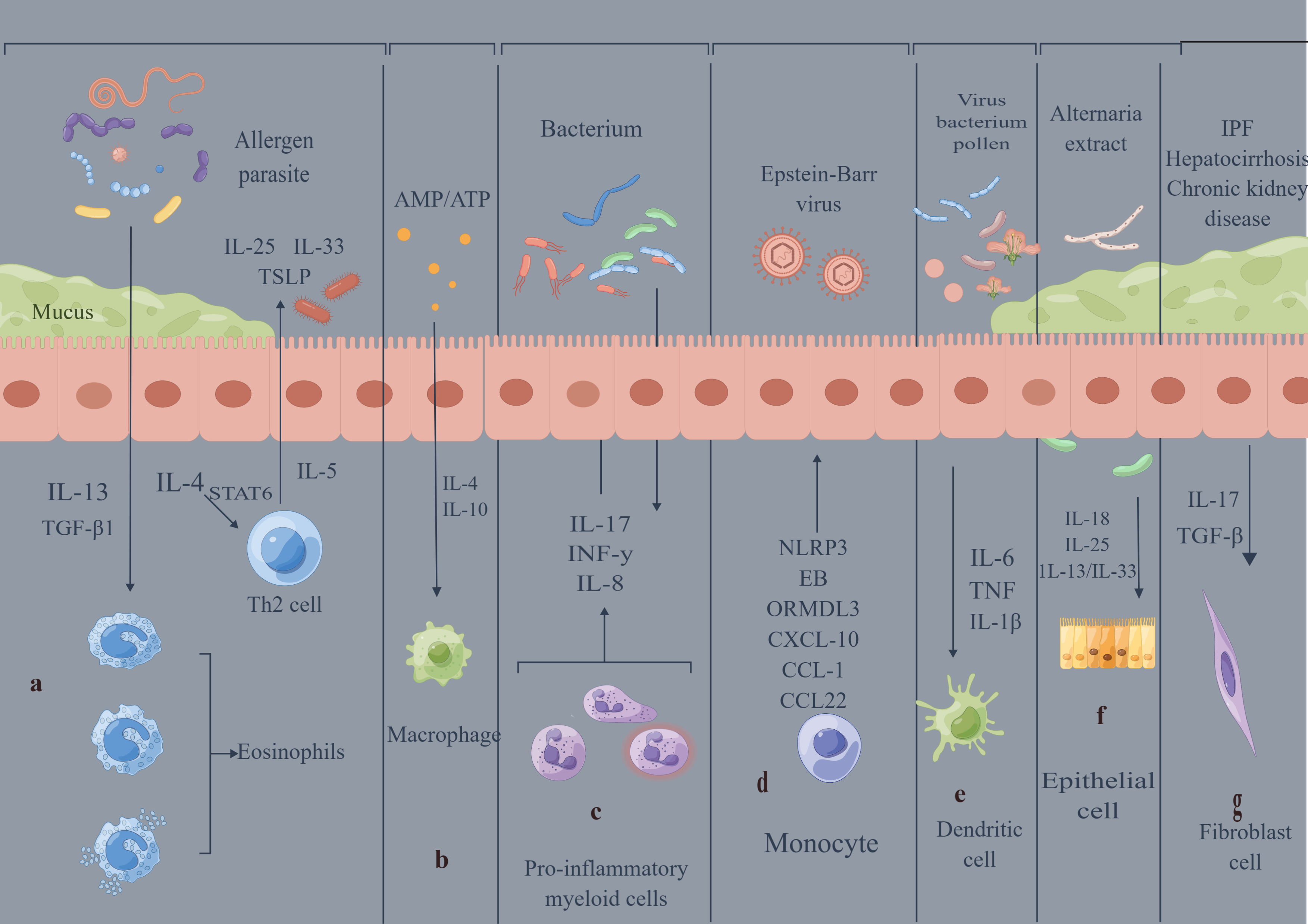 | d | Monocytes | NLRP3 induces monocytes activation, ARG transcription factor EB-mediated reprogramming of monocytes inflammatory response, asthma susceptibility risk alleles increase the expression of ORMDL3 in lung tissue, epithelial-derived TSLP reduces the production of the CXCL-10 and increases the production of CCL-1 and CCL-22. |