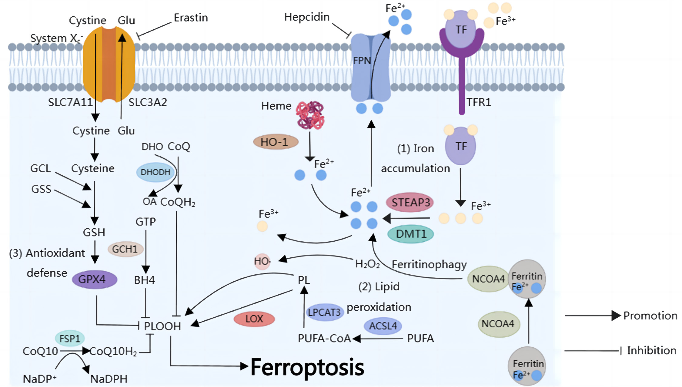 Fig. 1.Overview of ferroptosis. (1) Iron accumulation. Fe