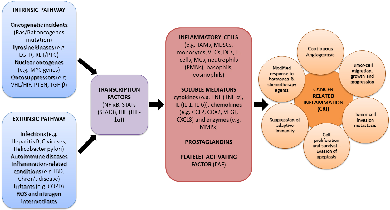Evidently, cancer emerges from the buildup of numerous genetic mutations and inappropriate expression/non-expression of associated genes (tumor inducing and/or tumor suppressing genes), as a result of the reciprocal connection between individual genetic or behavioral factors, and hence, prompts abnormalities in the control of mainly cell division, multiplication, tumor angiogenesis, and proliferation, all of which are usually associated with inflammatory manifestations [1, 3, 5, 14]. Inflammation is usually a normal response of our immune system against several insults, such as trauma and infections, but also against abnormal tumor formation and cancer. However, chronic inflammation increases the probability of cancer and enhances tumorigenesis and metastasis, by forming an inflammatory tumor microenvironment, that usually consists of engaged cancer, stromal and inflammatory cells [2, 14].