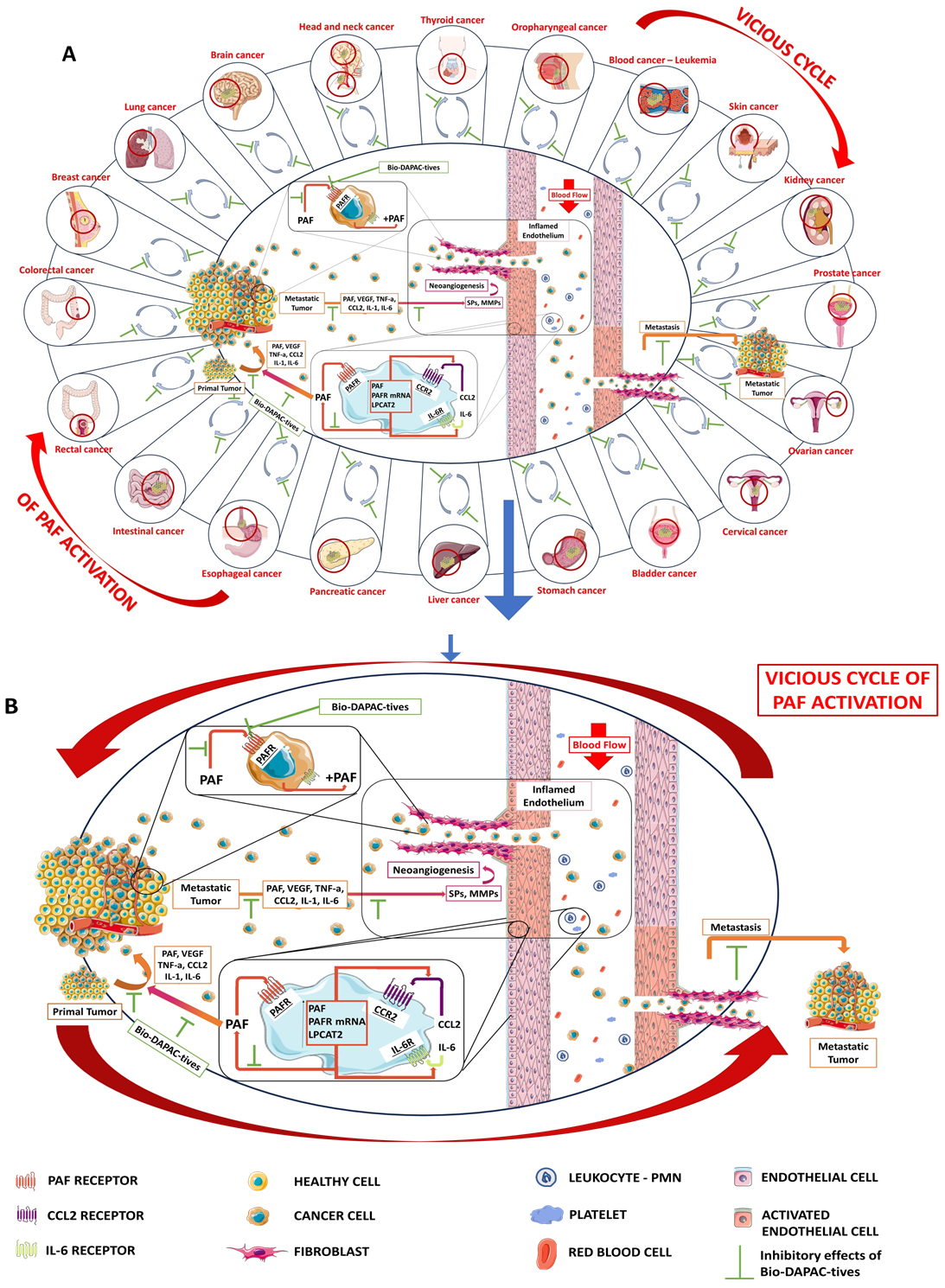 Platelet-activating factor (PAF) [15] is the most potent lipid inflammatory mediator that is implicated in chronic inflammatory manifestations involved in chronic disorders, including tumor formation and progression, through an interplay of its signaling with several cancer-related inflammatory cytokines and chemokines [1, 2]. A typical PAF molecule structure is generally known as 1-O-alkyl-2-acetyl-sn-glycero-3-phospho-choline [15], while other polar lipids and other molecules with similar structure and activity to those of PAF also exist. PAF and several PAF-like molecules are involved in many cancer-related pathological processes including angiogenesis, tumorigenesis and metastasis. A continuous inflammatory activation due to chronic or acute infections, environmental contributors, and lifestyle factors, is associated with the development of several cancer types, tumorigenesis, tumor growth and metastasis, with belligerent clinical features [16, 17]. Chronic inflammation specifically, induces carcinogenesis via reactive oxygen and nitrogen species, cytokines, PAF and prostaglandins, leading to neoplastic transformation, cancer promotion, and recurrence even after therapy. Notably, tumor cells themselves can initiate and propagate such PAF-associated inflammatory conditions that will further promote tumor development, and neo-angiogenetic and metastatic procedures [1, 2]. Therefore, systemic inflammation poses one of the predominant cancer-related mortality etiology [17, 18].