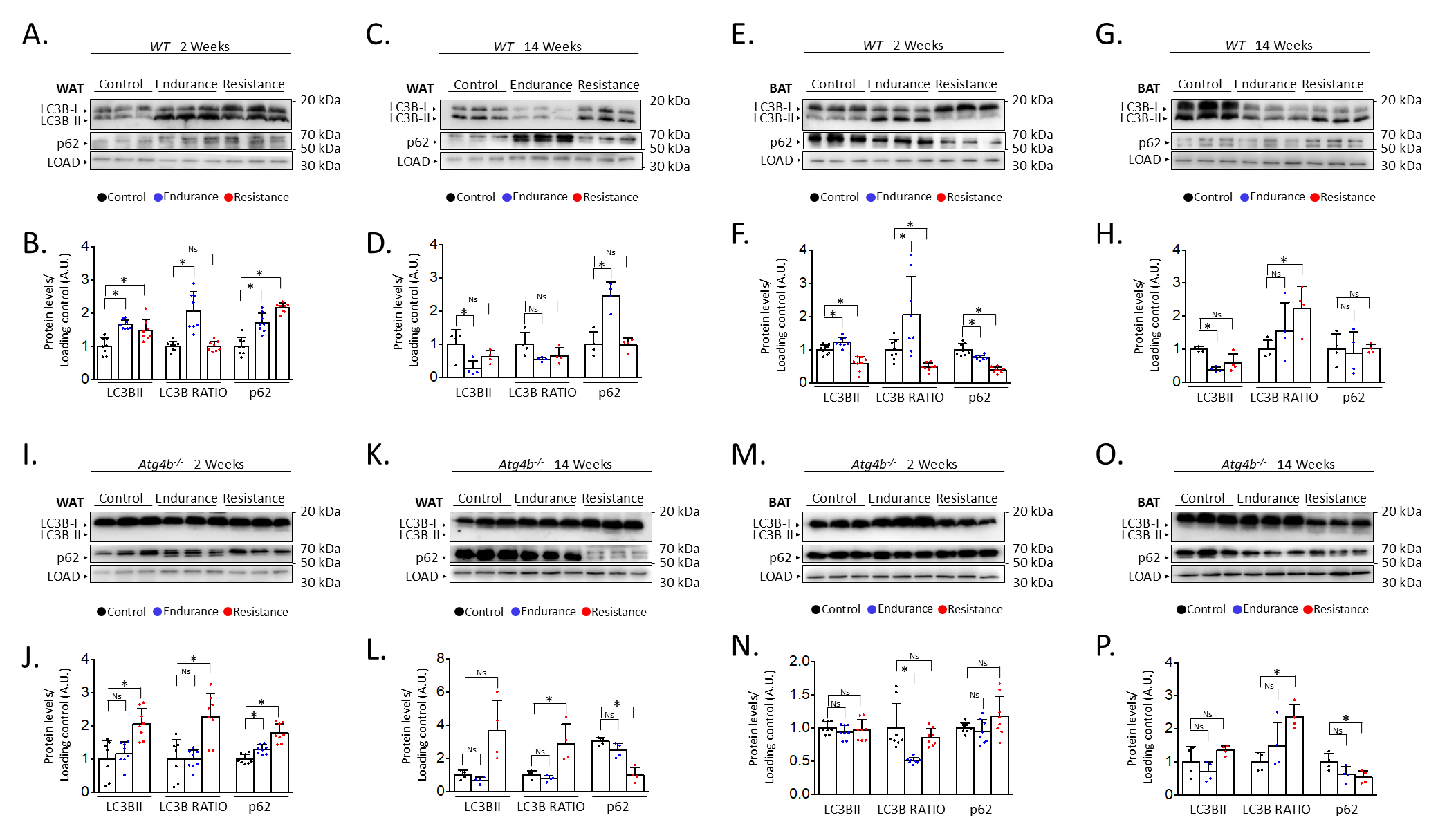 In conclusion, this study shows for the first time a distinct effect of different specific training protocols (resistance or endurance exercise, with short-term or prolonged training) in the levels of autophagy markers in WAT and BAT tissues. Moreover, using ATG4B-deficient mice with a hampered autophagic response, we observed that an alteration in the correct development of autophagy cannot be fully rescued by training protocols, which is essential when trying to understand if exercise is beneficial during aging when autophagy declines.