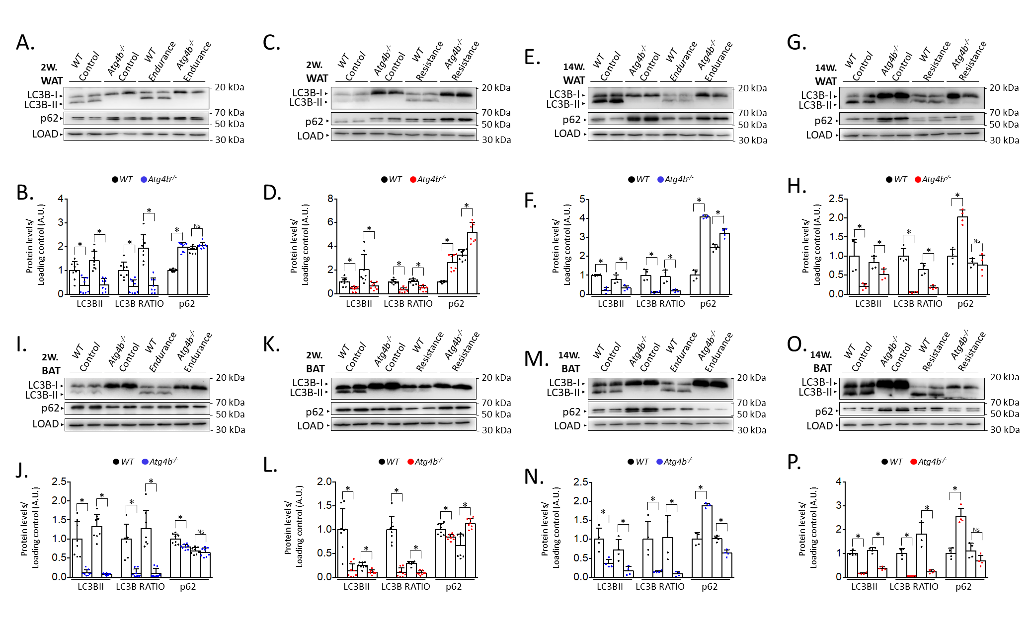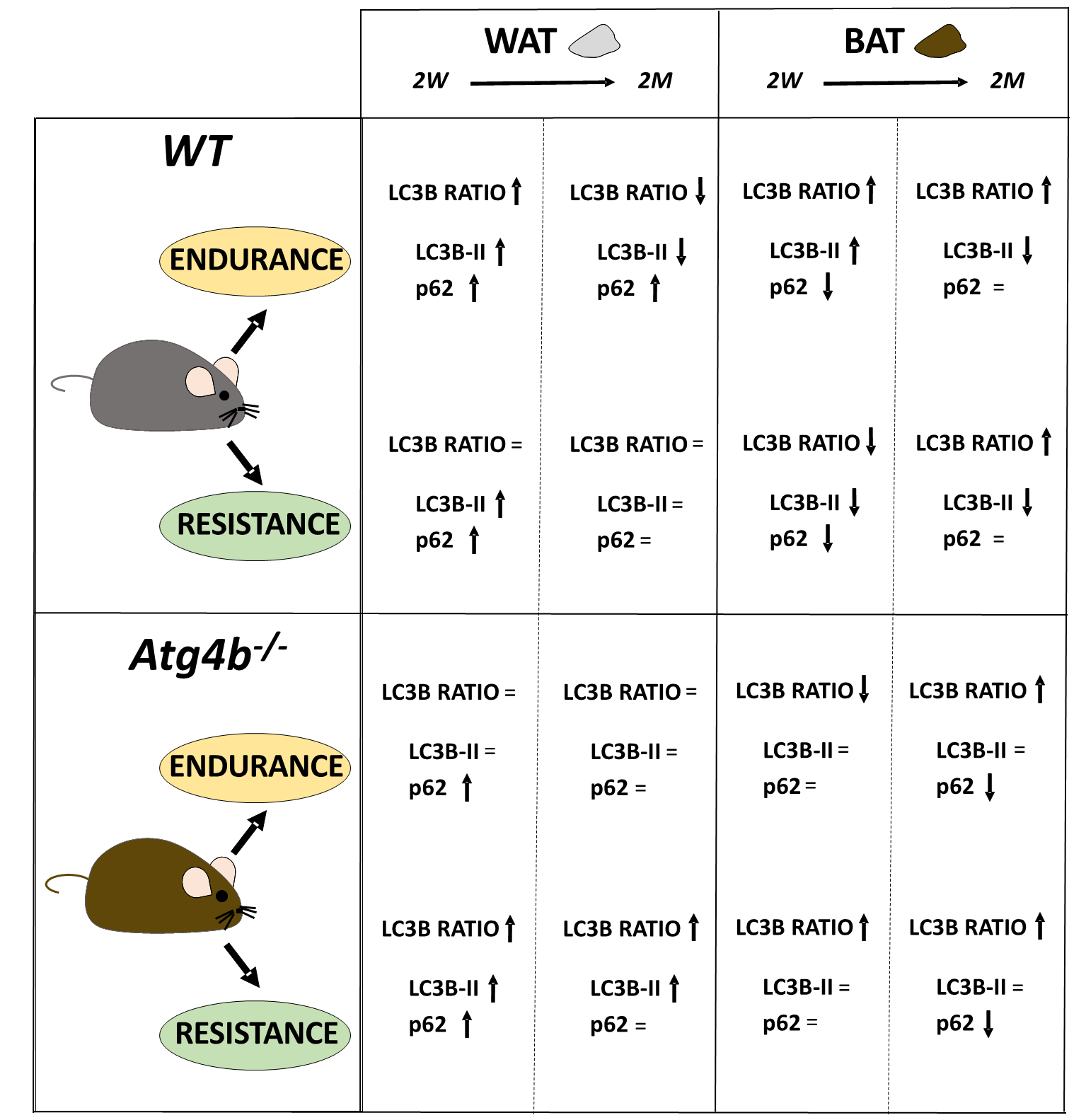 In wild-type mice, both short-term endurance and resistance training protocols increased the levels of autophagy markers in white adipose tissue before this similarity diverges during long training, while autophagy regulation appears to be far more complex in brown adipose tissue. Meanwhile, in ATG4B-deficient mice, only resistance training could slightly increase the presence of lipidated LC3B, while p62 levels increased in white adipose tissue after short-term training but decreased in brown adipose tissue after long-term training.