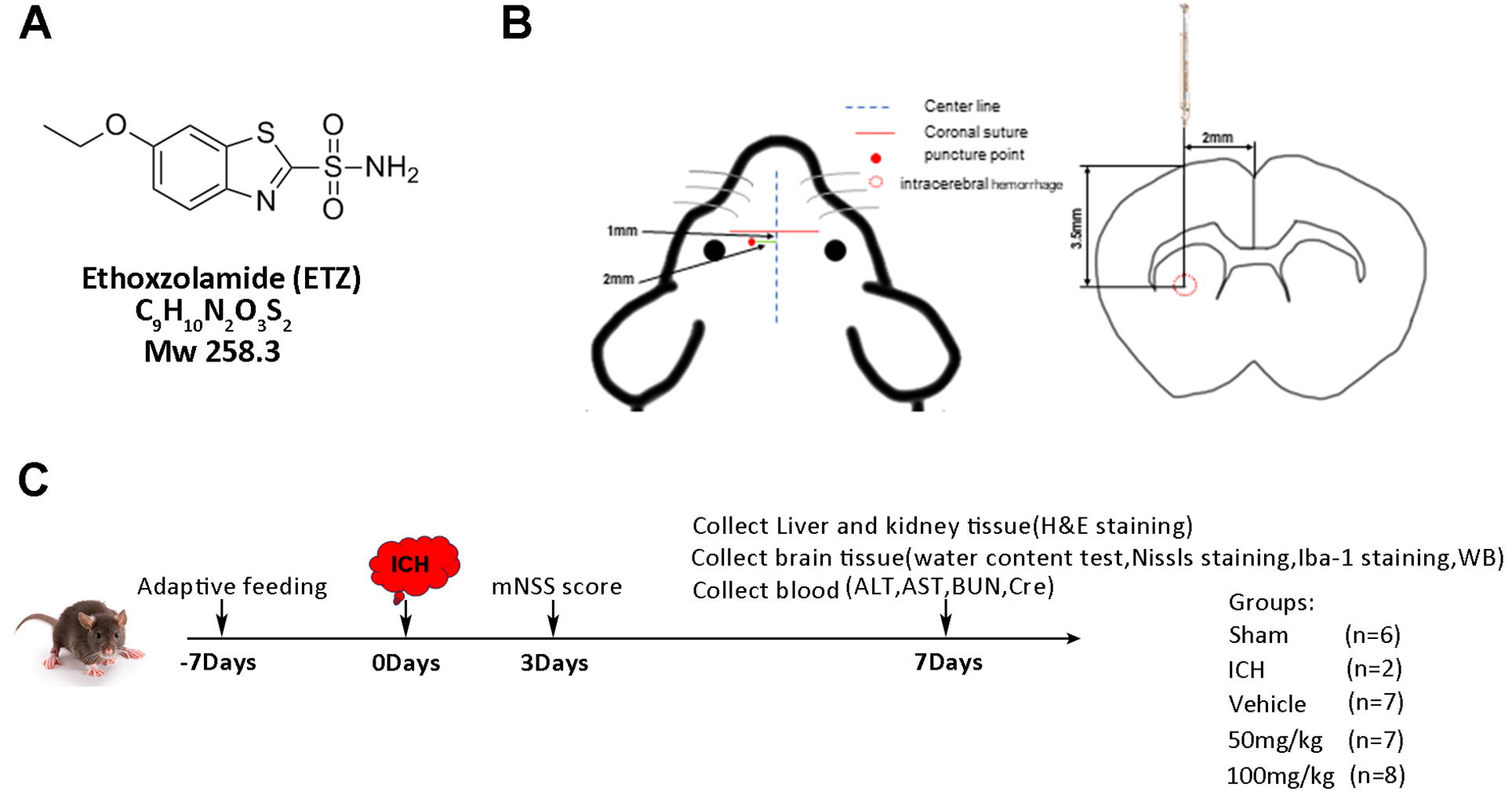 Experimental protocol and design. (A) Chemical structure, formula, and molecular weight of ETZ. (B) Schematic of the autologous blood injection method. (C) Experimental timeline. mNSS, Mouse neurological severity score; ICH, intracerebral hemorrhage; H&E, hematoxylin and eosin; ALT, alanine aminotransferase; AST, aspartate aminotransferase; BUN, blood urea nitrogen; Cre, creatinine.