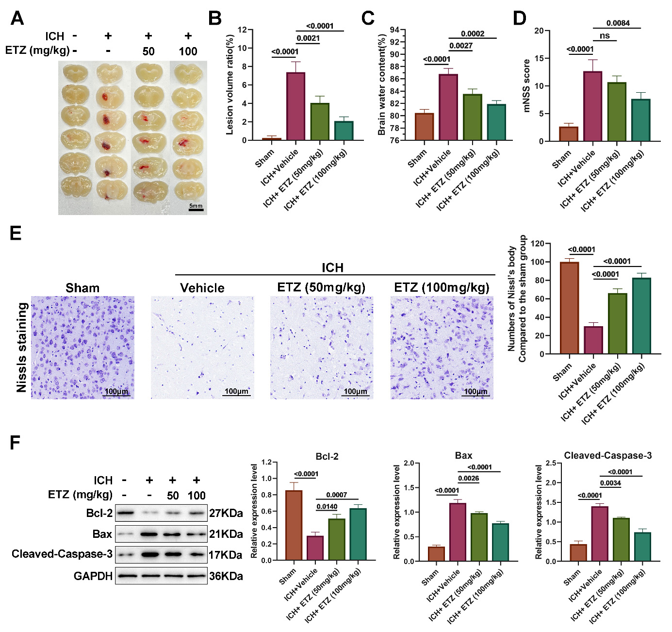 An autologous blood injection method was used to establish ICH models, which were then used to establish the effects of intraperitoneal injection of ETZ on ICH. Neuronal damage, apoptotic protein expression, oxidative and inflammatory factor content, microglia marker Iba-1 positivity, hepatic and renal pathological changes, and serum concentrations of hepatic and renal function indices were assessed by Nissl staining, western blotting, enzyme-linked immunosorbent assay (ELISA), immunohistochemistry, hematoxylin and eosin (HE) staining, and automatic biochemical analysis in brain tissues.