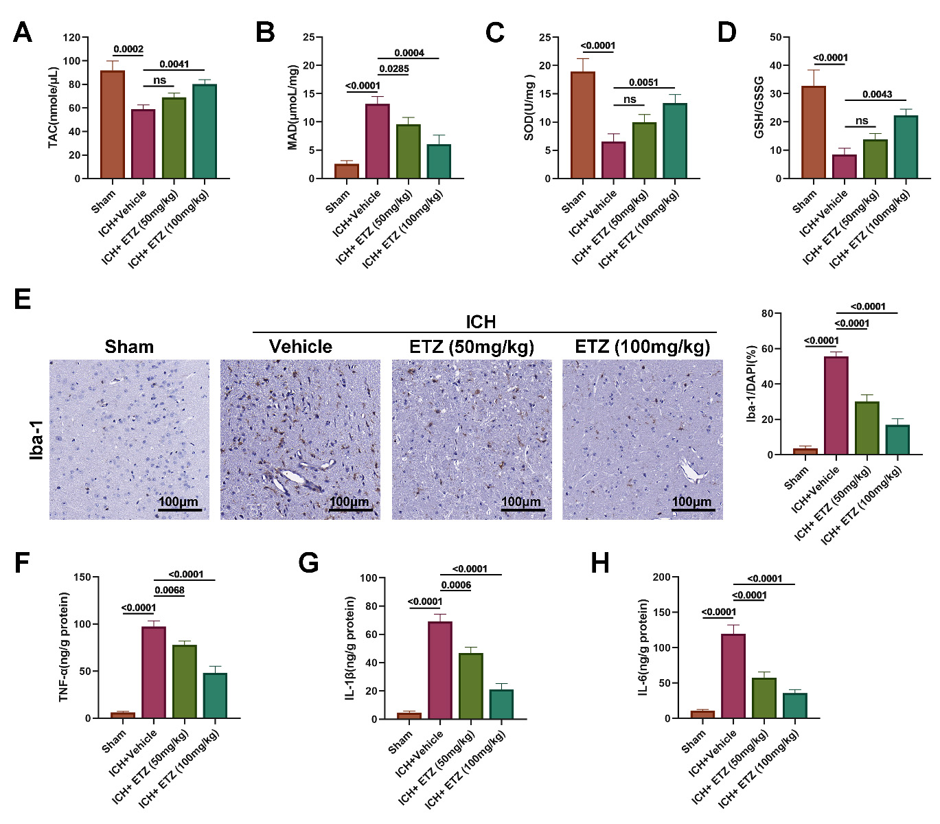 ETZ (50 or 100 mg/kg; n = 6). (E) Immunohistochemical measurement of Iba-1