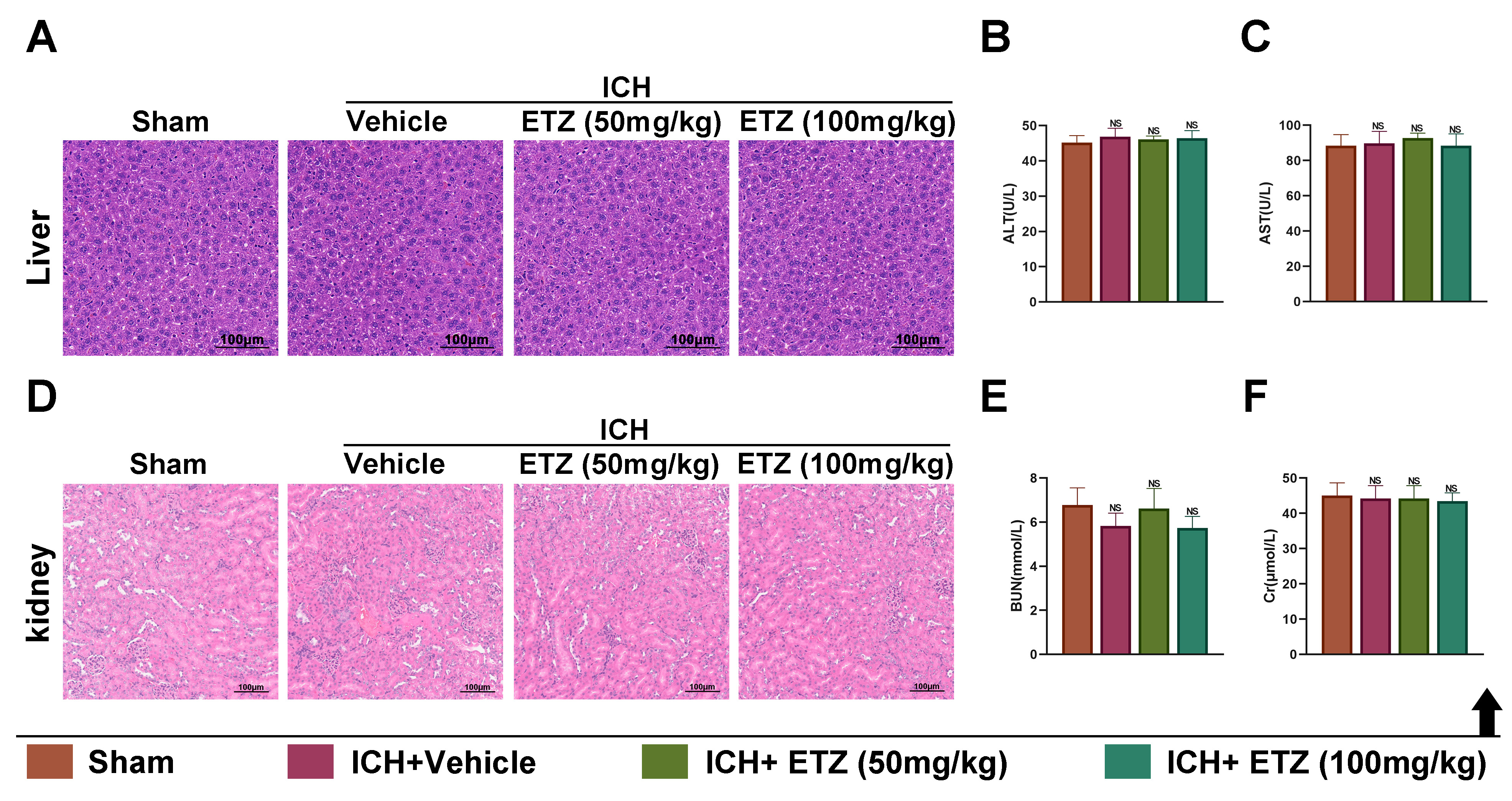 intraperitoneally with ETZ (50 or 100 mg/kg); n = 6. (D) HE measurement of pathological changes in renal tissue sections of ICH mice