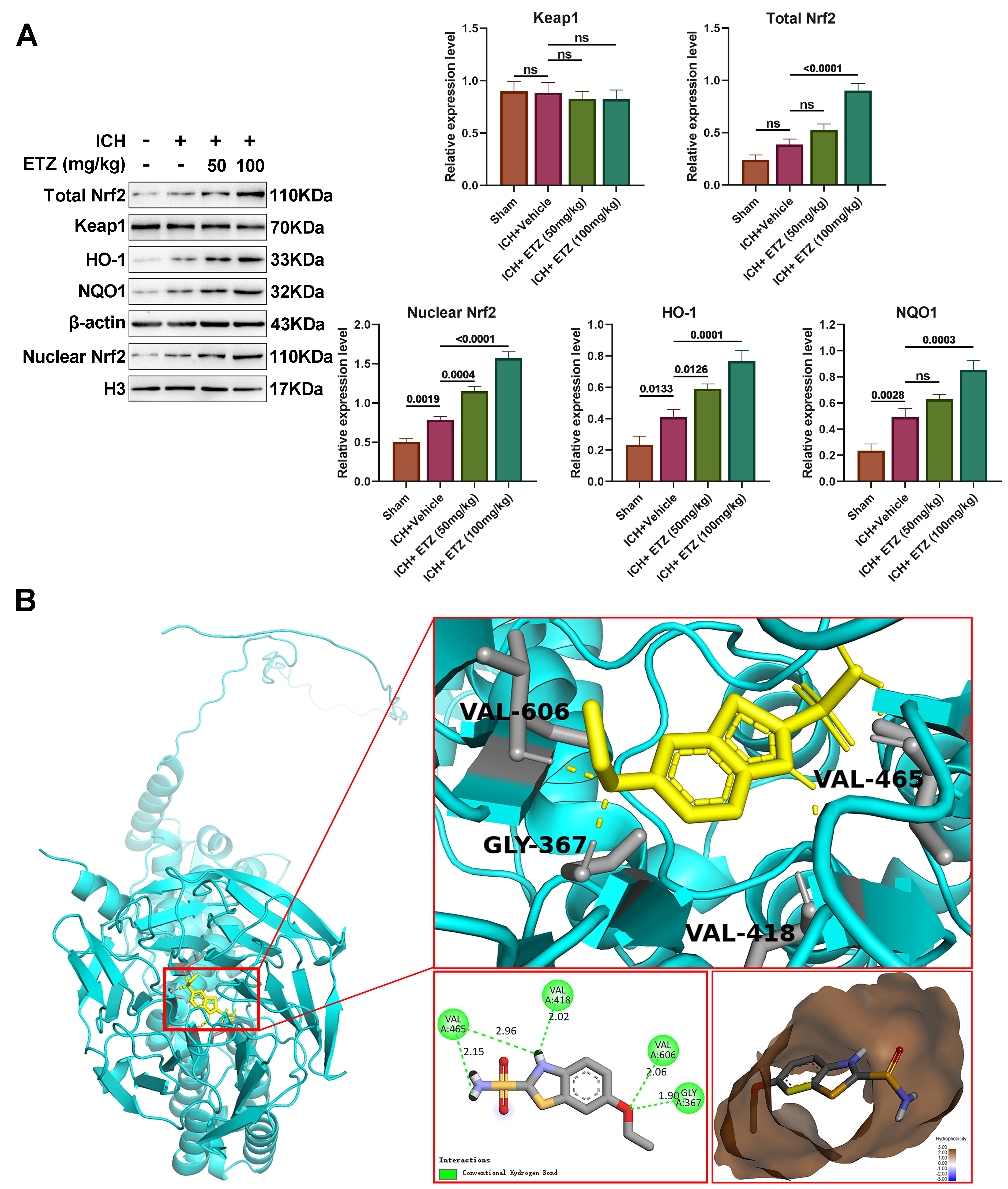The ICH group showed massive hemorrhagic foci; significant increases in brain water content, modified mouse neurological deficit scoring (mNSS) score, pro-apoptotic protein expression, oxidative factors, pro-inflammatory factors, and Iba-1 positivity; and significant reductions in Nissl body size, anti-apoptotic protein expression, and antioxidant factors, all of which were reversed by ETZ in a dose-dependent manner. ETZ has a good biosafety profile with no significant burden on the human liver or kidneys. The Kelch-like ECH-associated protein 1 (Keap1)/nuclear factor erythroid 2-related factor 2 (Nrf2) pathway was mildly activated in ICH mice, and was further increased after ETZ injection. Molecular docking experiments revealed that ETZ could dock onto the Nrf2-binding domain of keap1.