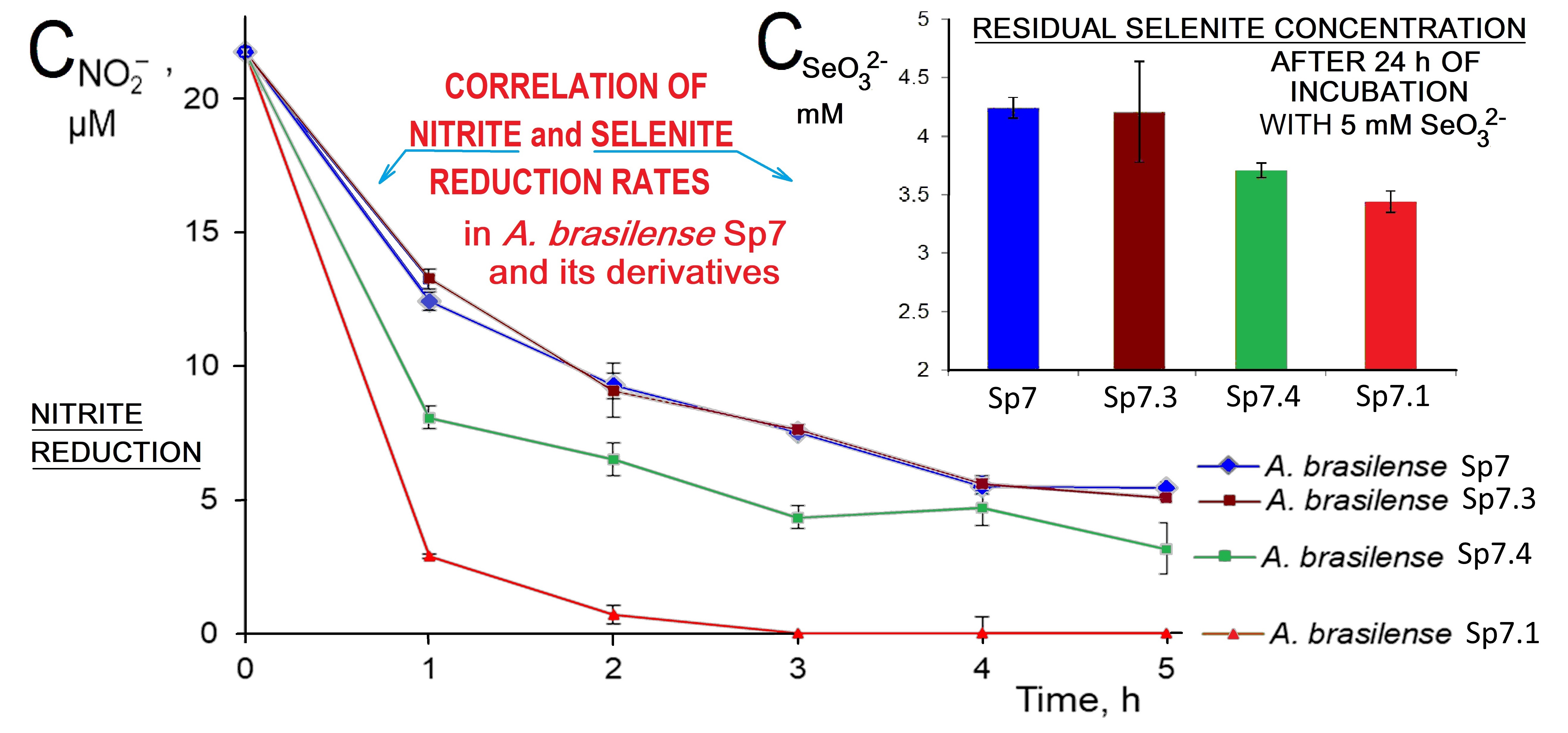 In a set of separate comparative studies of nitrite and selenite reduction by the wild-type strain A.brasilense Sp7 and its three specially selected derivatives (mutant strains) with different rates of nitrite reduction, a direct correlation was found between their nitrite and selenite reduction rates for all the strains used in the study. Moreover, for BSO it has been shown that its presence does not block selenite reduction in A.brasilense Sp7.