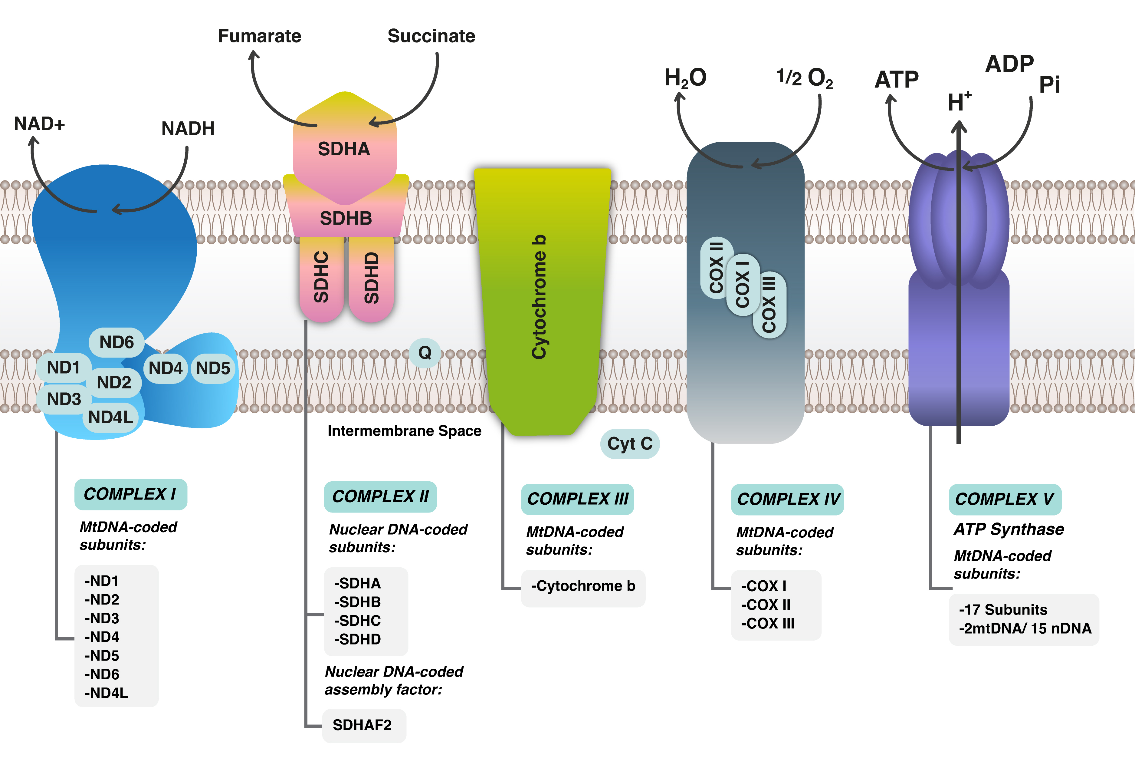 Dinucleotide [NADH]), complex II (Succinate Dehydrogenase [SDH]), complex III