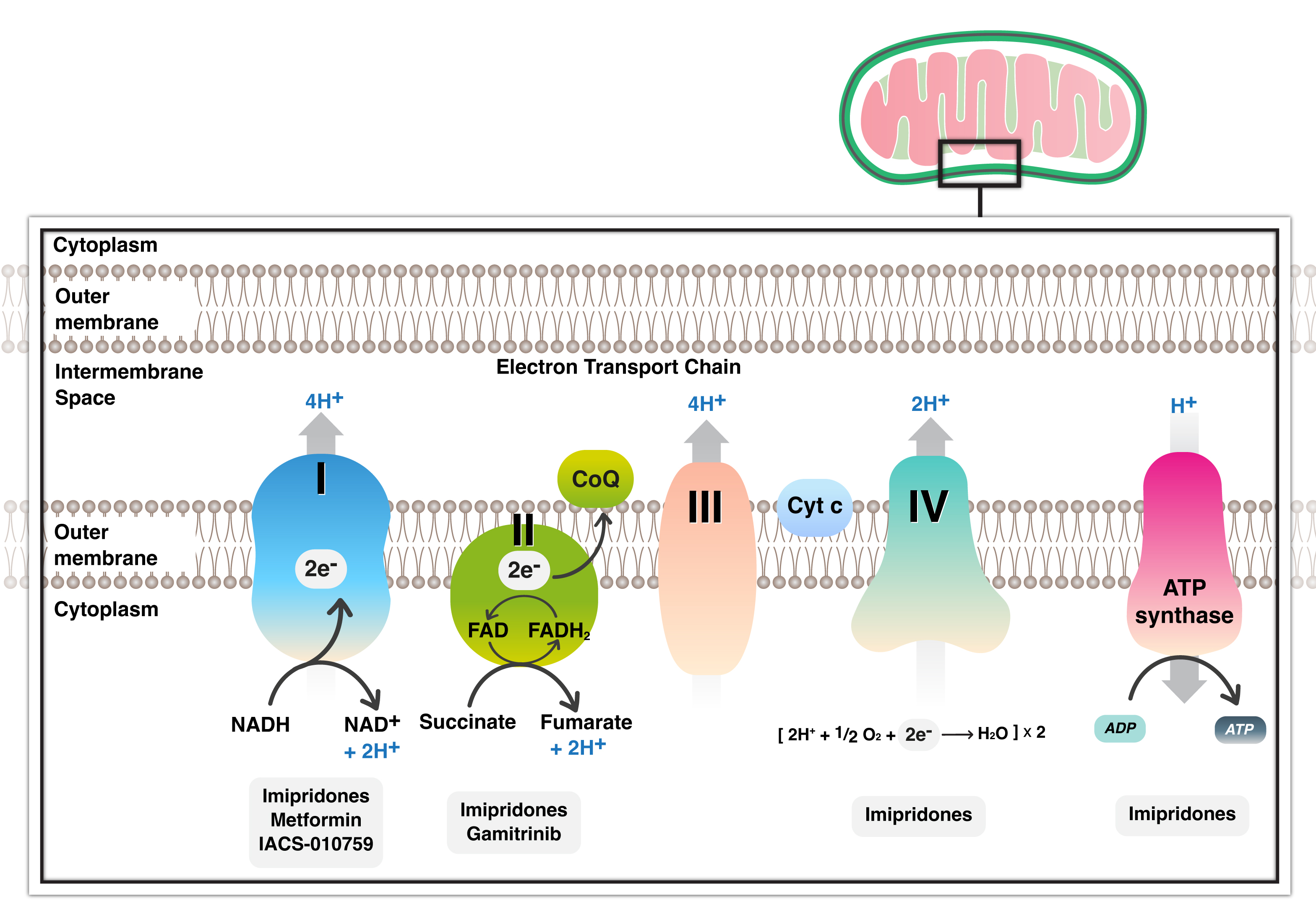 Inhibitors of mitochondrial respiratory chain with all complexes currently present in glioblastoma treatment. Several inhibitors target complex I and II and several complexes with metformin, gamitrinib and imipridone respectively. NADH, Nicotinamide adenine dinucleotide; FADH, Flavin adenine dinucleotide; CoQ, Coenzyme Q; Cyt, Cytochrome; ATP, Adenosine triphosphate.