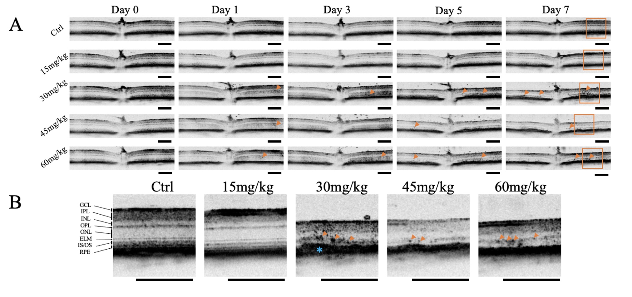 5-, and 7-days post-injection (n = 4 per group). (A) Representative OCT images of