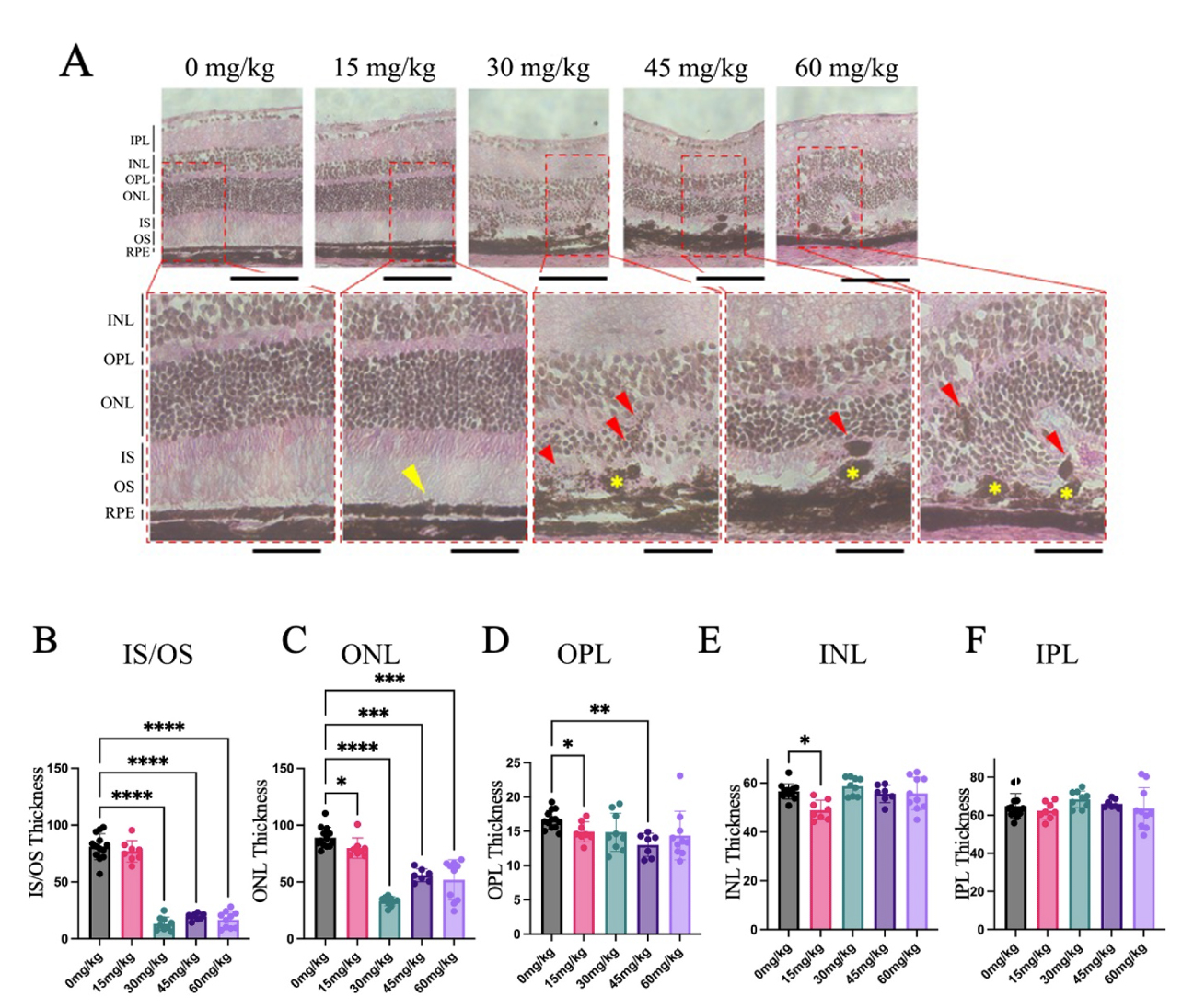 given 30, 45, and 60 mg/kg NaIO3 (yellow asterisk), and abnormal retinal