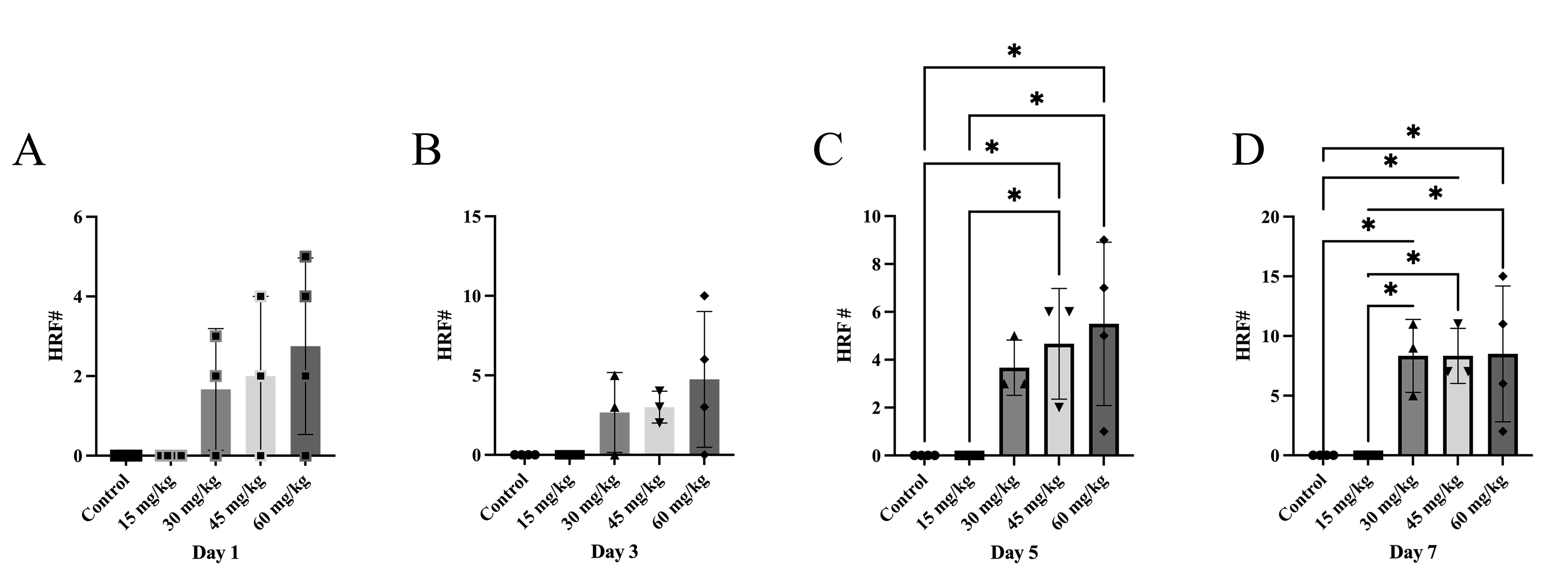 mice given 30 mg/kg, 45 mg/kg, and 60 mg/kg by 5 days post-injection (Fig. 1).