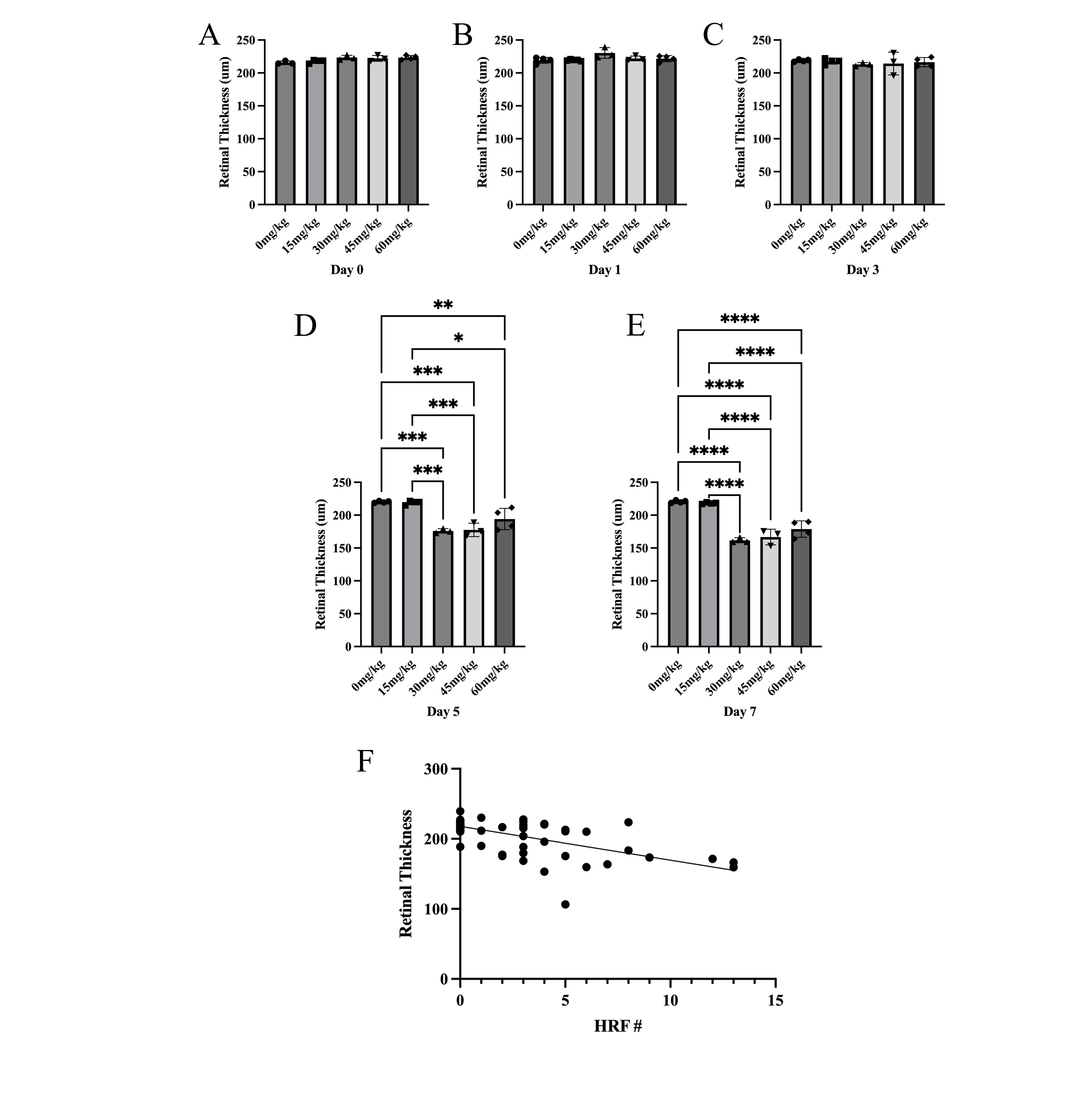 (A–E) Total retinal thickness (µm) was measured 0, 1, 3, 5, and 7