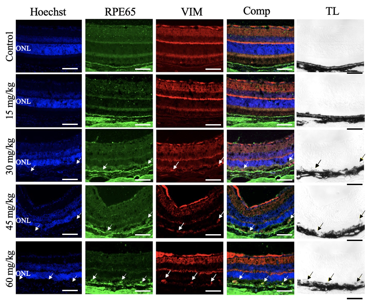 Sodium Iodate Induced Vimentin Expression in the Retinal Pigment Epithelium Layer. Representative confocal images of retinal sections from mice 7 days after NaIO3 injection, immunolabelled for RPE65 (green) and vimentin (VIM, red) and counterstained for nuclei with Hoechst (blue) (n = 4 per group). The overlay column (Comp) shows the merged image of all three fluorescent channels. The transmitted light channel (TL) is shown in the righthand column. First row: Control conditions. There was no VIM+ immunoreactivity in the RPE layer. Second row: NaIO3 15 mg/kg. No VIM+ immunoreactivity was detected in the RPE layer. Third row: NaIO3, 30 mg/kg. VIM+ and RPE65+ immunoreactivity colocalized (white arrows) and in the pigmented RPE layer (black arrows). Fourth row: NaIO3, 45 mg/kg. VIM+ and RPE65+ immunoreactivity colocalized (white arrows) in the pigmented RPE layer (black arrows). Fifth Row: NaIO3, 60 mg/kg. VIM+ and RPE65+ immunoreactivity colocalized abundantly (white arrows) in the pigmented RPE layer (black arrows). ONL, outer nuclear layer. Scale bar = 50 µm.