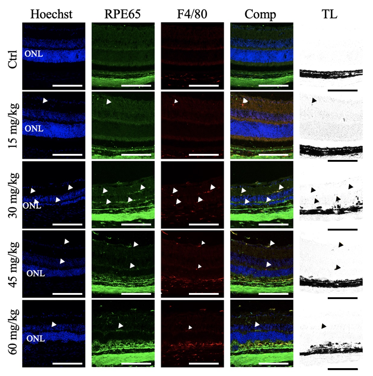 Sodium Iodate Increased F4/80+ Immunoreactivity in the Retinal Pigment Epithelial Layer and Neural Retina. Representative confocal images of retinal sections from mice 7 days after NaIO3 injection, immunolabelled for RPE65 (green) and F4/80 (red), and counterstained for nuclei with Hoechst (blue) (n = 4 per group). The overlay column (Comp) shows the merged image of all three fluorescent channels. The transmitted light (TL) channel is shown in the righthand column. F4/80+ immunoreactivity was observed in the choroid in all treatment groups. First row: Control. F4/80+ immunoreactivity was restricted to the choroid. Second row: NaIO3 15 mg/kg. F4/80+ immunoreactivity colocalized with RPE65 infrequently in the neural retina in addition to the choroid (white arrowheads) and corresponded to pigmented puncta (black arrowheads). Third row: NaIO3, 30 mg/kg. abundant F4/80+ immunoreactivity partially colocalized with RPE65 in the neural retina and RPE layer, in addition to the choroid (white arrowheads), and corresponded to pigmented puncta (black arrowheads). Fourth row: NaIO3, 45 mg/kg. F4/80+ immunoreactivity partially colocalized with RPE65 in the neural retina and RPE layer, in addition to the choroid (white arrowheads), and corresponded to pigmented puncta (black arrowheads). Fifth Row: NaIO3, 60 mg/kg. Occasional F4/80+ immunoreactivity partially colocalized with RPE65 in the neural retina and RPE layer, in addition to the choroid (white arrowheads), and corresponded to pigmented puncta (black arrowheads). ONL, outer nuclear layer. Scale bar = 50 µm.