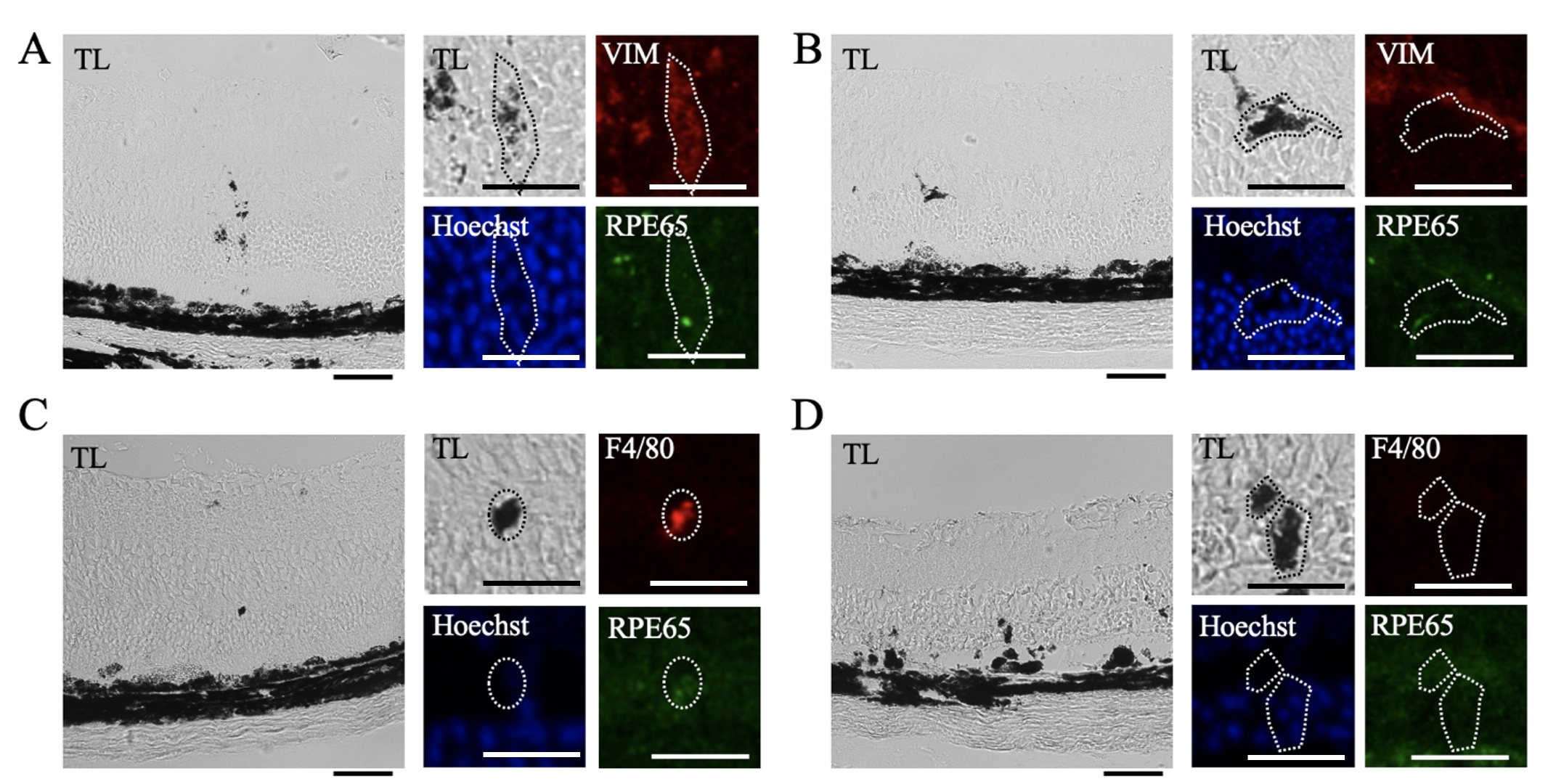 Heterogeneous Vimentin and F4/80 Immunoreactivity in Pigmented Anomalies. Pigmented anomalies were identified by transmitted light and compared to corresponding confocal images in retinal sections from mice 7 days after NaIO3 injection. Sections were immunolabelled for RPE65 (green) and F4/80 (red) or VIM (red), and nuclear counterstained with Hoechst (blue) (n = 4 per group). (A) Pigmented lesions identified in transmitted light (TL) images corresponded to Hoechst stain, some RPE65 immunoreactivity, and VIM immunoreactivity. (B) In other cases, pigmented lesions had Hoechst staining but no VIM or RPE65 immunoreactivity. (C) Pigmented lesions also partially corresponded to RPE65 and F4/80 immunoreactivity. (D) In other areas, pigmented lesions had Hoechst staining but no RPE65 or F4/80 immunoreactivity. Scale bar = 50 µm. Magnified scale bar = 25 µm.