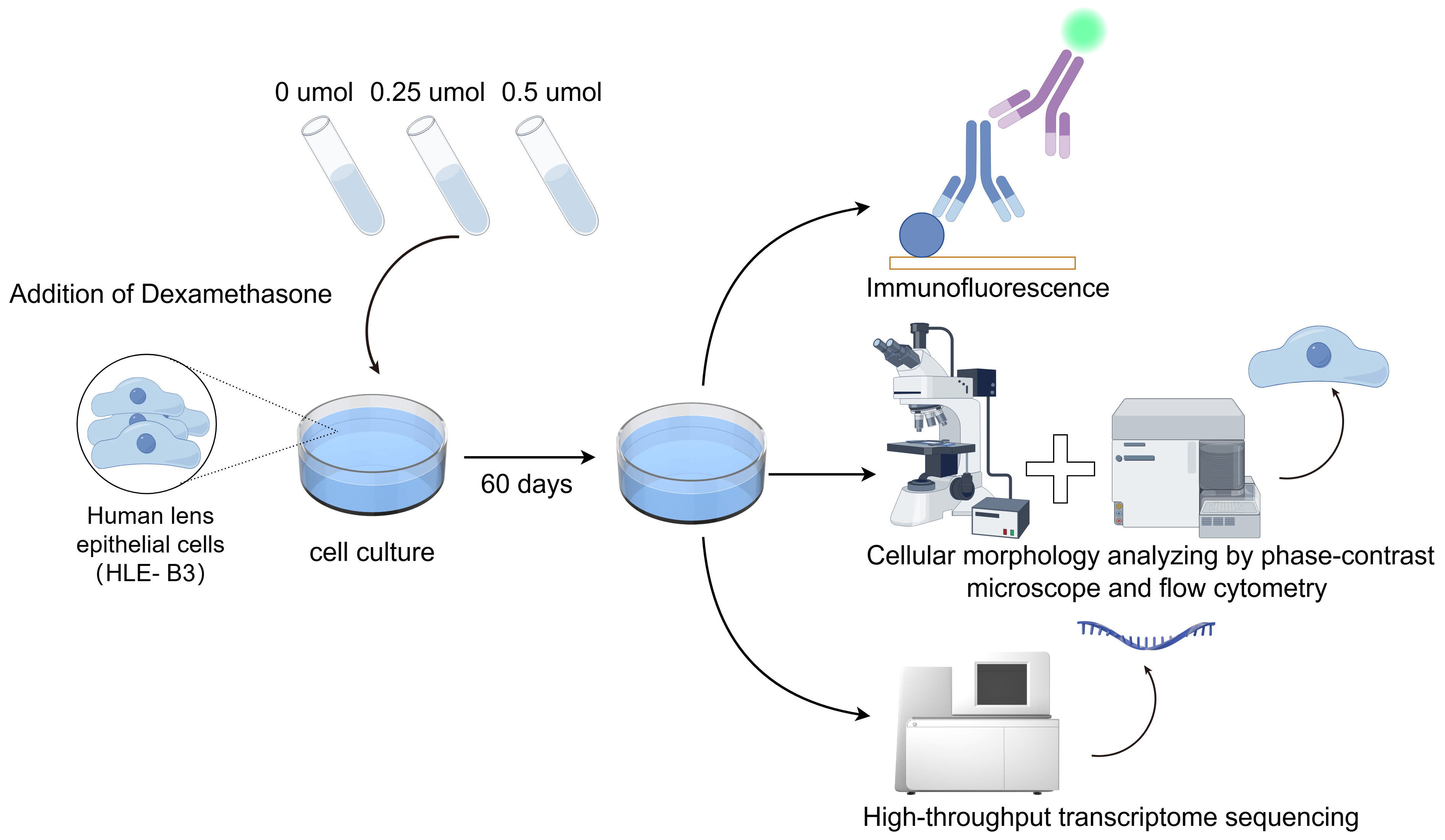 Study workflow. This diagram outlines the entire process from cell culture to data analysis. Initially, human lens epithelial cells (HLE-B3) were cultured and treated with different concentrations of dexamethasone (0, 0.25, and 0.5 µM) for 60 days. Subsequent steps included cell size measurement using phase-contrast microscopy, flow cytometry analysis, and high-throughput transcriptome sequencing. By Figdraw (https://www.figdraw.com/#/).