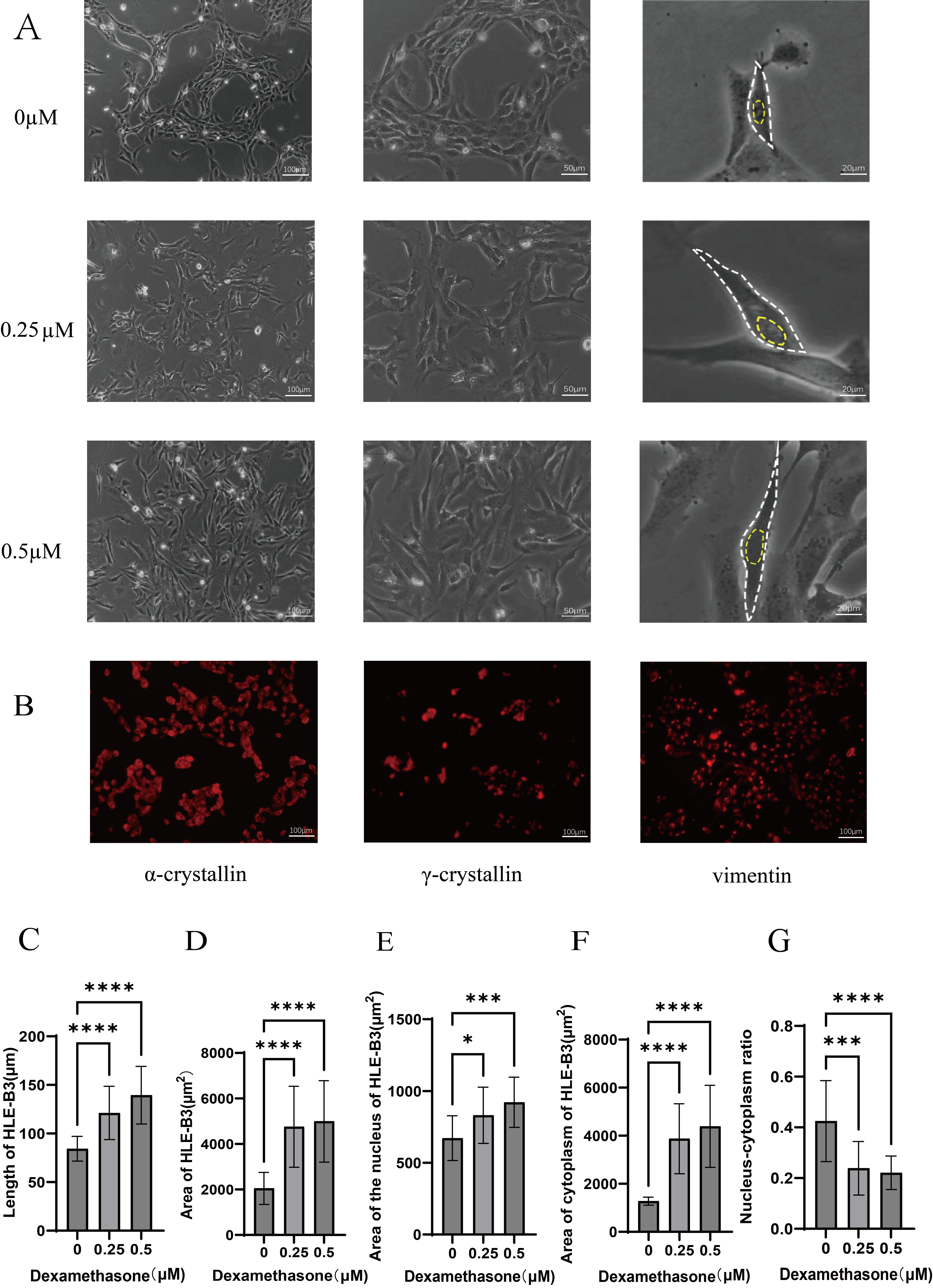 HLECs (HLE-B3) were cultured in vitro to assess the effects of dexamethasone on cell size at different concentrations. Immunofluorescence staining was used to detect specific protein expression in HLE-B3 cells. The cell size was observed using phase-contrast microscopy, and the length and area were quantitatively measured with ImageJ software for statistical analysis. Flow cytometry was used to verify these outcomes. The means of three groups were statistically analyzed using one-way analysis of variance, whereas the means of two groups were statistically analyzed with the parametric Student’s t-test. Additionally, high-throughput transcriptome sequencing was performed to compare messenger RNA (mRNA) expression levels between different concentrations of dexamethasone treatment groups and the control group, to identify potential signaling pathways. Subsequently, we performed quantitative Polymerase Chain Reaction (qPCR), immunofluorescence staining, and molecular docking experiments on the key differentially expressed genes.