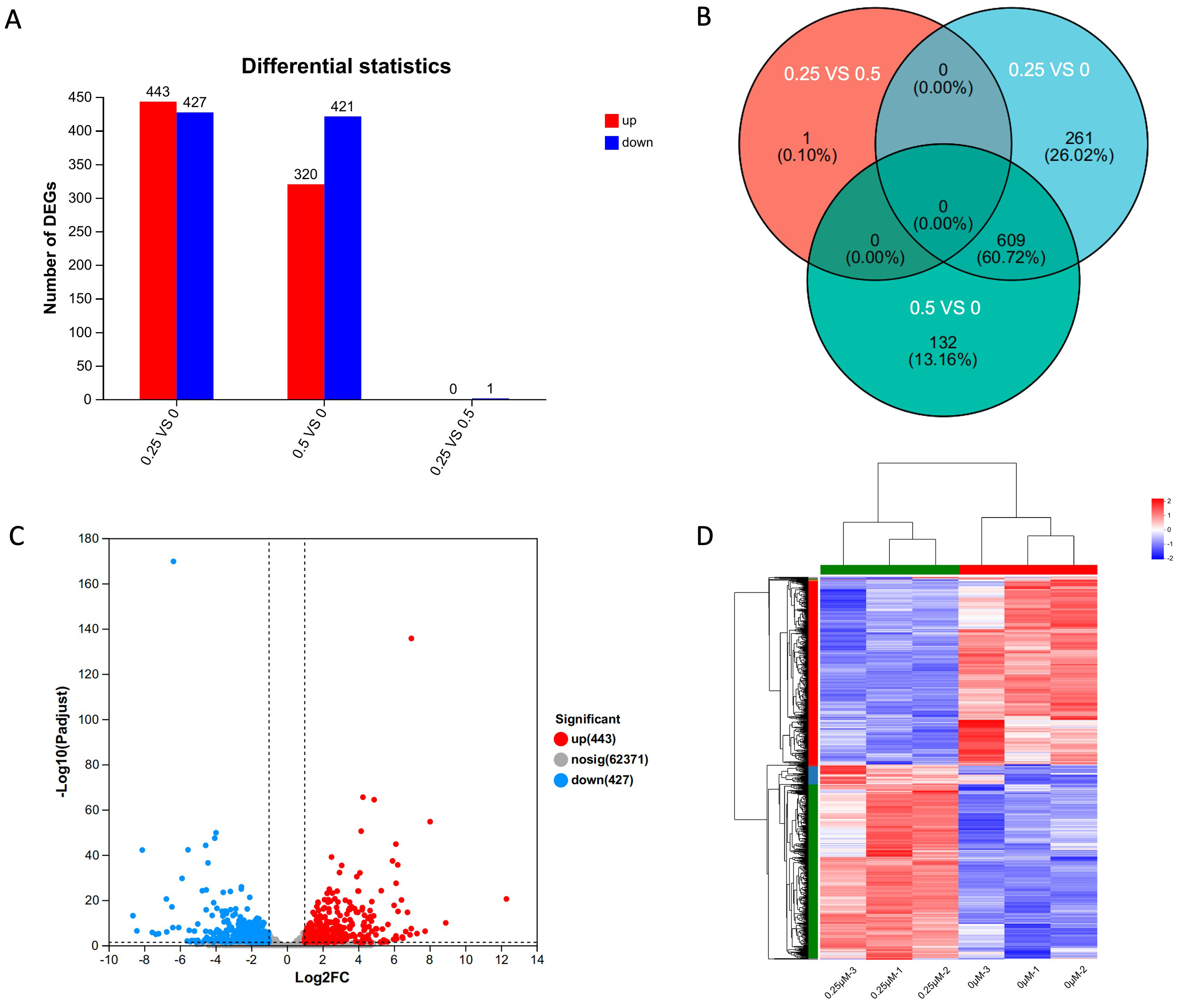 To investigate the specific mechanisms by which dexamethasone affects the morphology and function of HLECs, we performed high-throughput transcriptome sequencing on the control, 0.25, and 0.5 µM groups. Analysis of DEGs suggested that there was only one DEG between the 0.25 and 0.5 µM dexamethasone groups (Fig. 4A,B). Therefore, we subsequently chose to compare the control group and 0.25 µM dexamethasone group for further analyses.