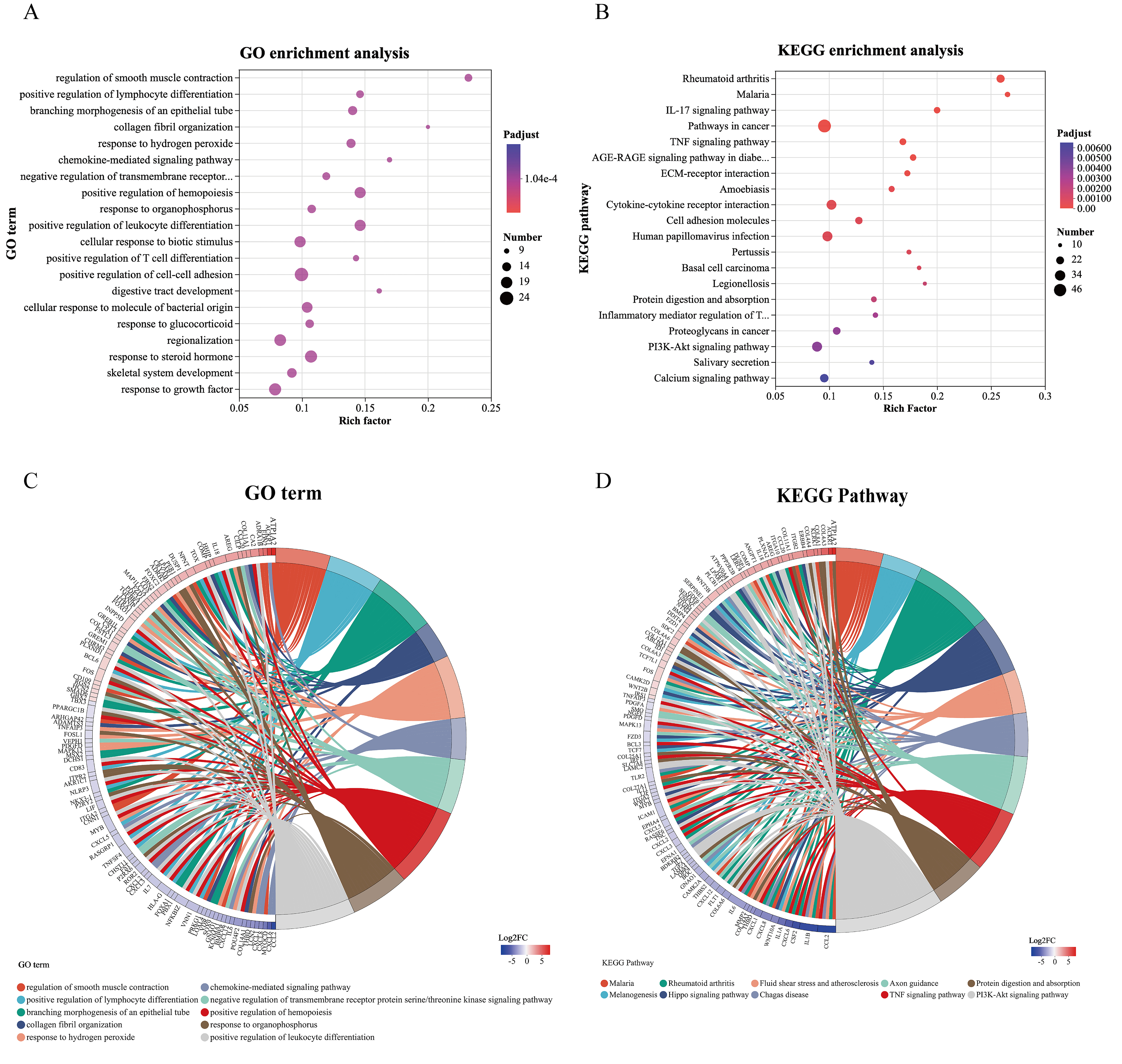 GO and KEGG enrichment analyses. (A) Bubble plot illustrating the GO enrichment analysis between the control group and 0.25 µmol/L dexamethasone group. The x-axis represents the rich factor, whereas the y-axis lists the GO terms. The bubble size indicates the number of genes, and the bubble color corresponds to the adjusted p-value (padjust). (B) Bubble plot illustrating KEGG pathway enrichment analysis between the control group and the 0.25 mmol/L dexamethasone group. The x-axis represents the rich factor, whereas the y-axis lists the KEGG pathways. The bubble size indicates the number of genes, and the bubble color corresponds to the padjust. (C) Enriched chordal diagram showing the relationships between the DEGs and enriched GO terms. The different colors represent various GO terms. (D) Enriched chordal diagram showing the relationships between DEGs and enriched KEGG terms. Different colors represent various KEGG terms. DEGs, Differentially expressed genes; GO, Gene Ontology; KEGG, Kyoto Encyclopedia of Genes and Genomes.