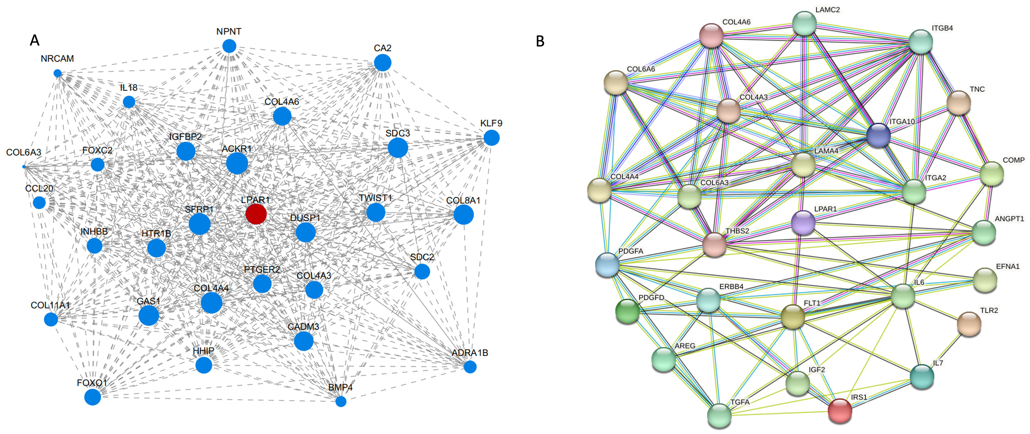 Recognition of hub genes and the protein–protein interaction network. (A) Network display of key genes. (B) Each node represents a protein, and the lines represent an association between proteins. COL4A6, Collagen Type IV Alpha 6 Chain; COL6A6, Collagen Type VI Alpha 6 Chain; COL4A4, Collagen Type IV Alpha 4 Chain; COL4A3, Collagen Type IV Alpha 3 Chain; COL6A3, Collagen Type VI Alpha 3 Chain; LAMC2, Laminin Subunit Gamma 2; LAMA4, Laminin Subunit Alpha 4; ITGB4, Integrin Beta 4; ITGA10, Integrin Alpha 10; ITGA2, Integrin Alpha 2; TNC, Tenascin C; COMP, Cartilage Oligomeric Matrix Protein; LPAR1, Lysophosphatidic Acid Receptor 1; THBS2, Thrombospondin 2; PDGA, Platelet-Derived Growth Factor Alpha; PDGFD, Platelet-Derived Growth Factor D; ERBB4, Erb-B2 Receptor Tyrosine Kinase 4; ANGPT1, Angiopoietin 1; AREG, Amphiregulin; FLT1, Fms Related Tyrosine Kinase 1; IL6, Interleukin 6; EFNA1, Ephrin A1; TGFA, Transforming Growth Factor Alpha; IGF2, Insulin-Like Growth Factor 2; IRS1, Insulin Receptor Substrate 1; IL7, Interleukin 7; TILR2, T cell immunoreceptor with Ig and ITIM domains 2.