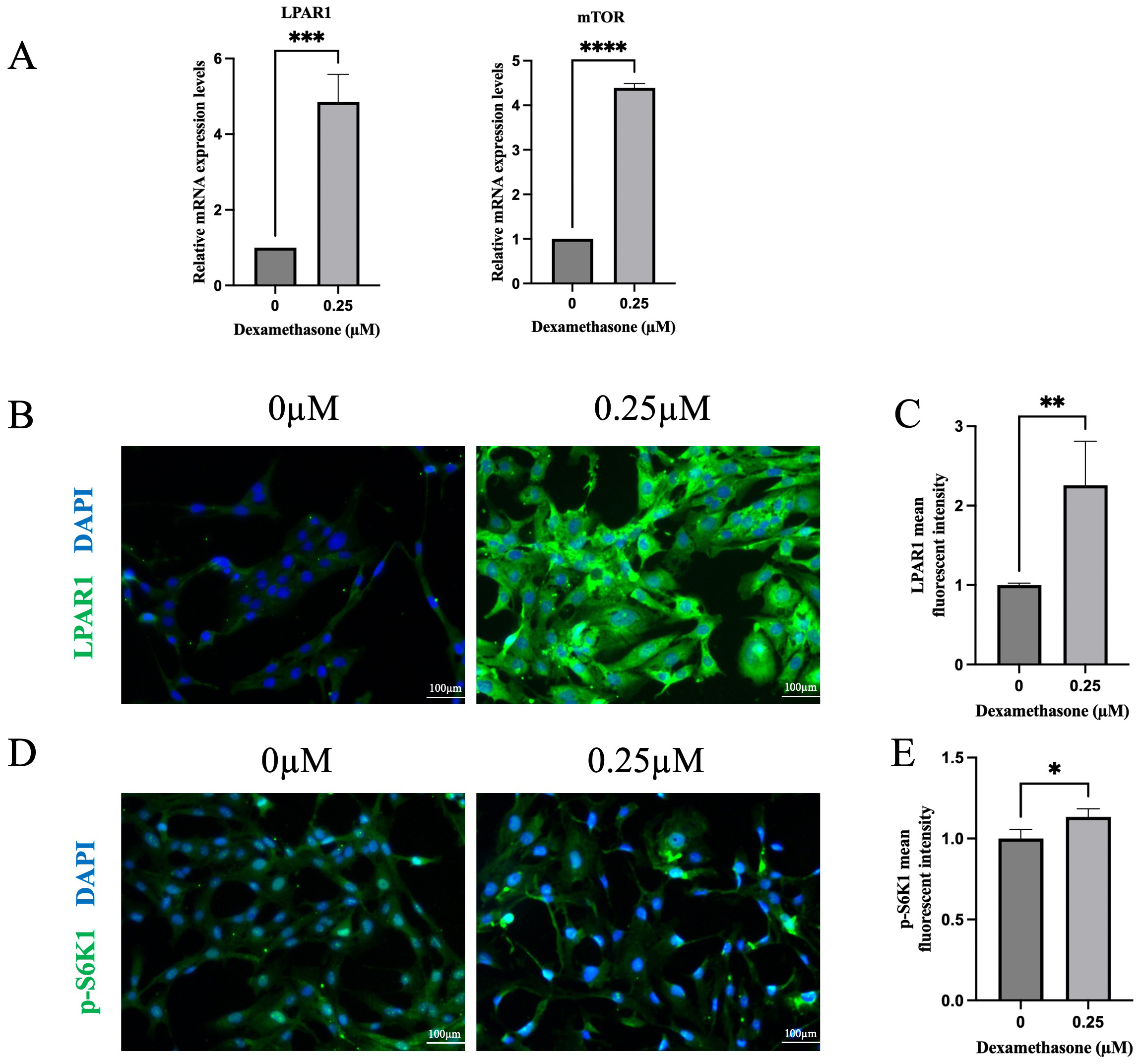 HLE-B3 cells, either untreated or co-cultured with 0.25 µM dexamethasone for 60 days, were fixed for 15 minutes in 4% paraformaldehyde at room temperature. After fixation, cells were permeabilized using 0.1% Triton X-100 for 10 minutes and then blocked with 1% bovine serum albumin (BSA) for 1 hour at room temperature. Cells were incubated overnight at 4 °C with primary antibodies against LPAR1 and phosphorylated S6K1 (p-S6K1). Following three washes with PBS, cells were incubated with appropriate fluorophore-conjugated secondary antibodies for 1 hour in the dark at ambient temperature. Nuclei were stained with DAPI for 5 minutes, and coverslips were mounted on slides using anti-fade mounting medium. Fluorescence images were acquired using a fluorescence microscope, and ImageJ software 1.54f (National Institutes of Health, Bethesda, MD, USA) was employed to quantify the fluorescence intensity of LPAR1 and p-S6K1. Three independent repeat experiments were conducted.