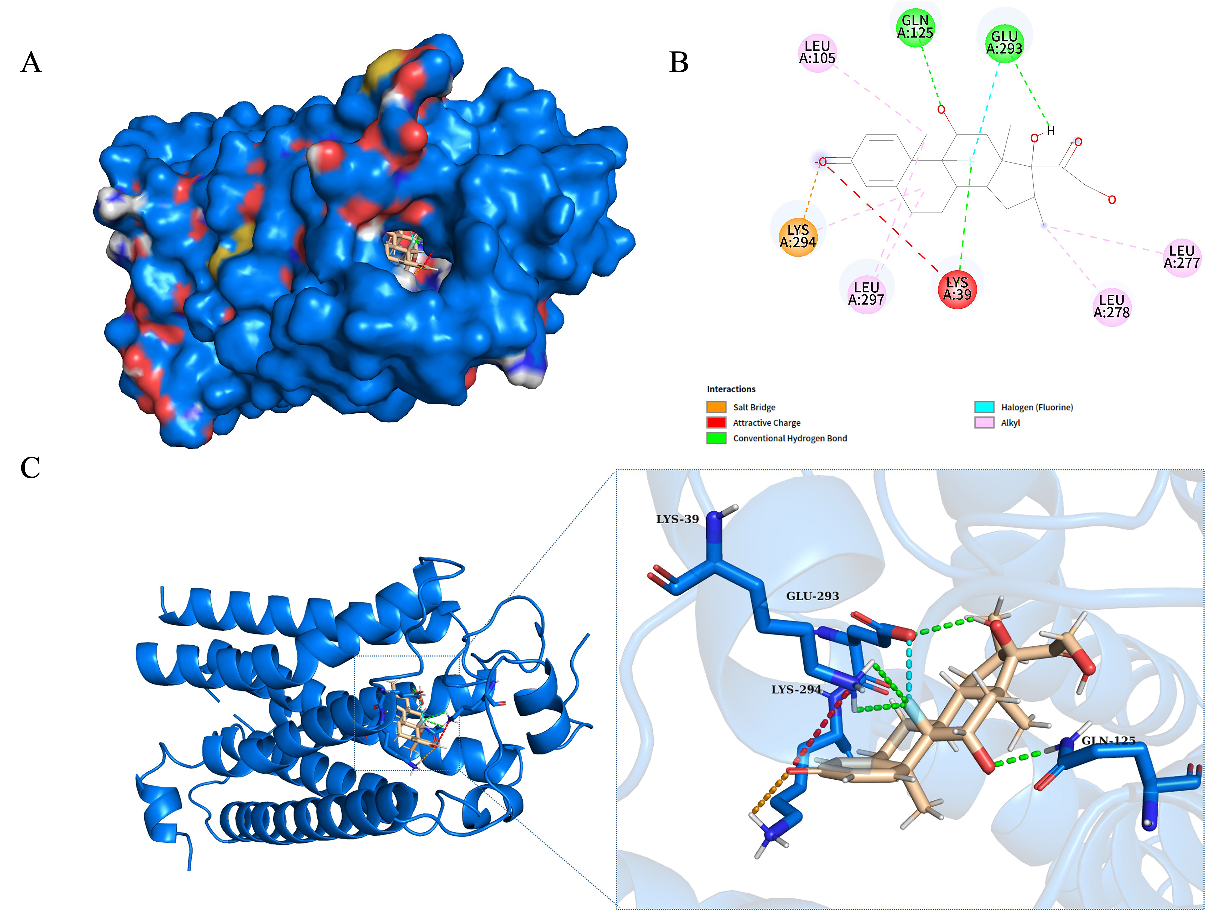 Molecular docking results of LPAR1 protein with dexamethasone. (A) Surface representation of LPAR1 protein (blue) bound to dexamethasone (sticks in the binding pocket) illustrating the spatial fit and overall surface interactions. (B) 2D interaction diagram highlighting the key residues involved in the interaction between LPAR1 and dexamethasone. The diagram shows hydrogen bonds (green lines), attractive charge interactions (red lines), and salt bridges (orange lines). Involved residues include LYS39, LYS294, GLU293, GLN125, and several hydrophobic interactions (LEU105, LEU297, LEU278, and LEU277). (C) 3D cartoon representation of LPAR1 with a close-up of the binding pocket. The detailed view shows hydrogen bonding and electrostatic interactions between LPAR1 residues (blue sticks) and dexamethasone (beige sticks), with LYS39, GLU293, and LYS294 playing key roles.