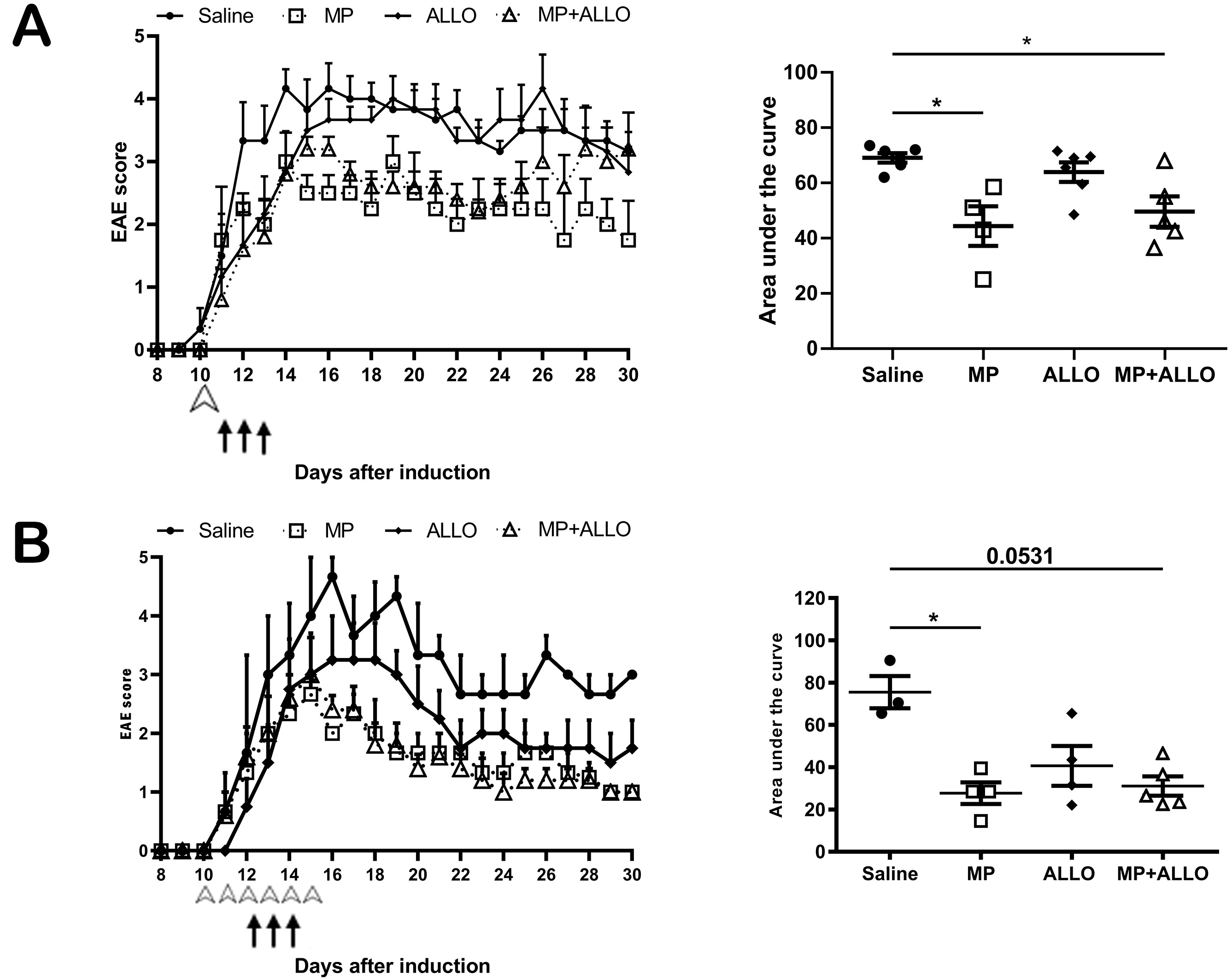 for the MP+ALLO group. (B) Daily recording of EAE clinical score in treated and