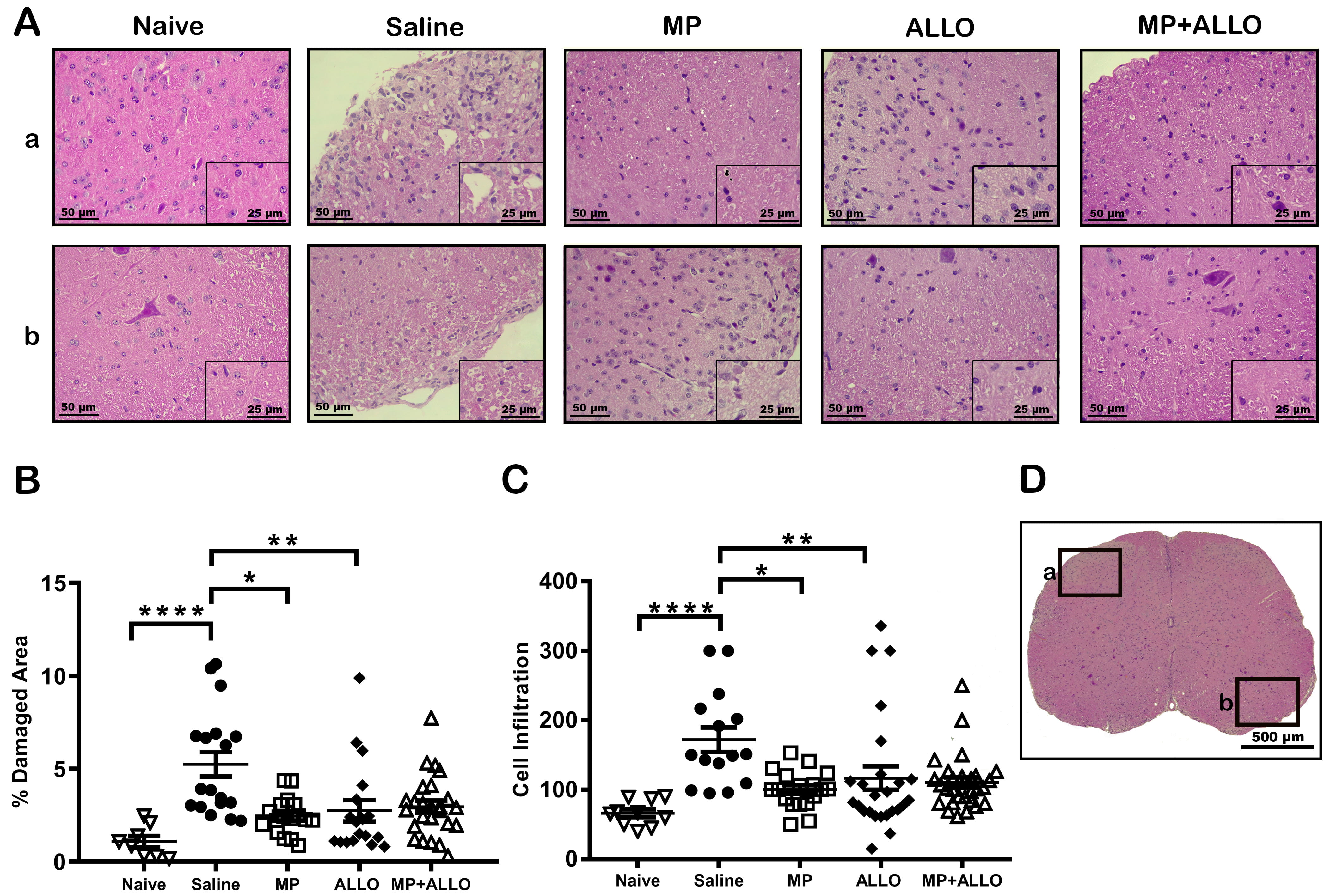 cord sections). MP, ALLO and MP+ALLO treatments diminished the EAE effect on the